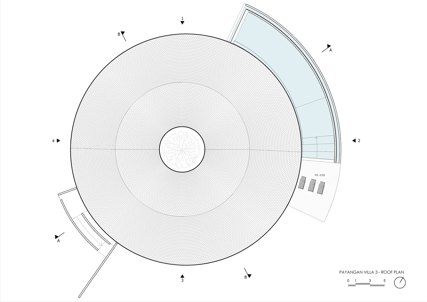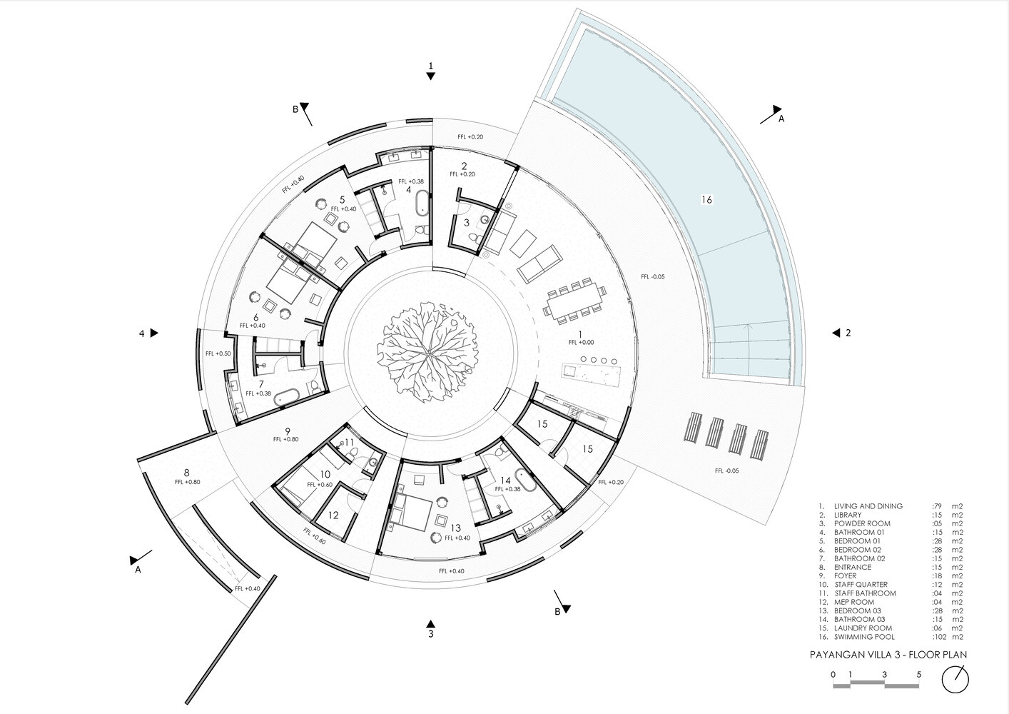 The entire building is organized around a single center point. Concentric circles define the plan, the pool, the pathways, and many built-in elements.