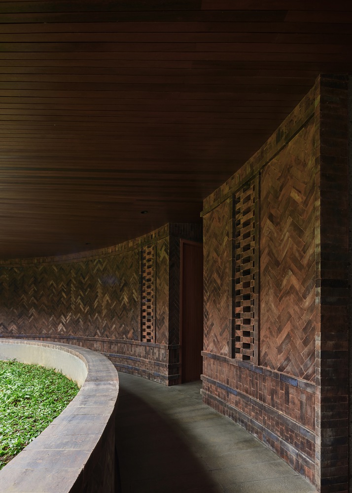 Brickwork laid in herringbone patterns, interlaced wall textures, and subtle geometric motifs reinterpret local craft in a contemporary way.
