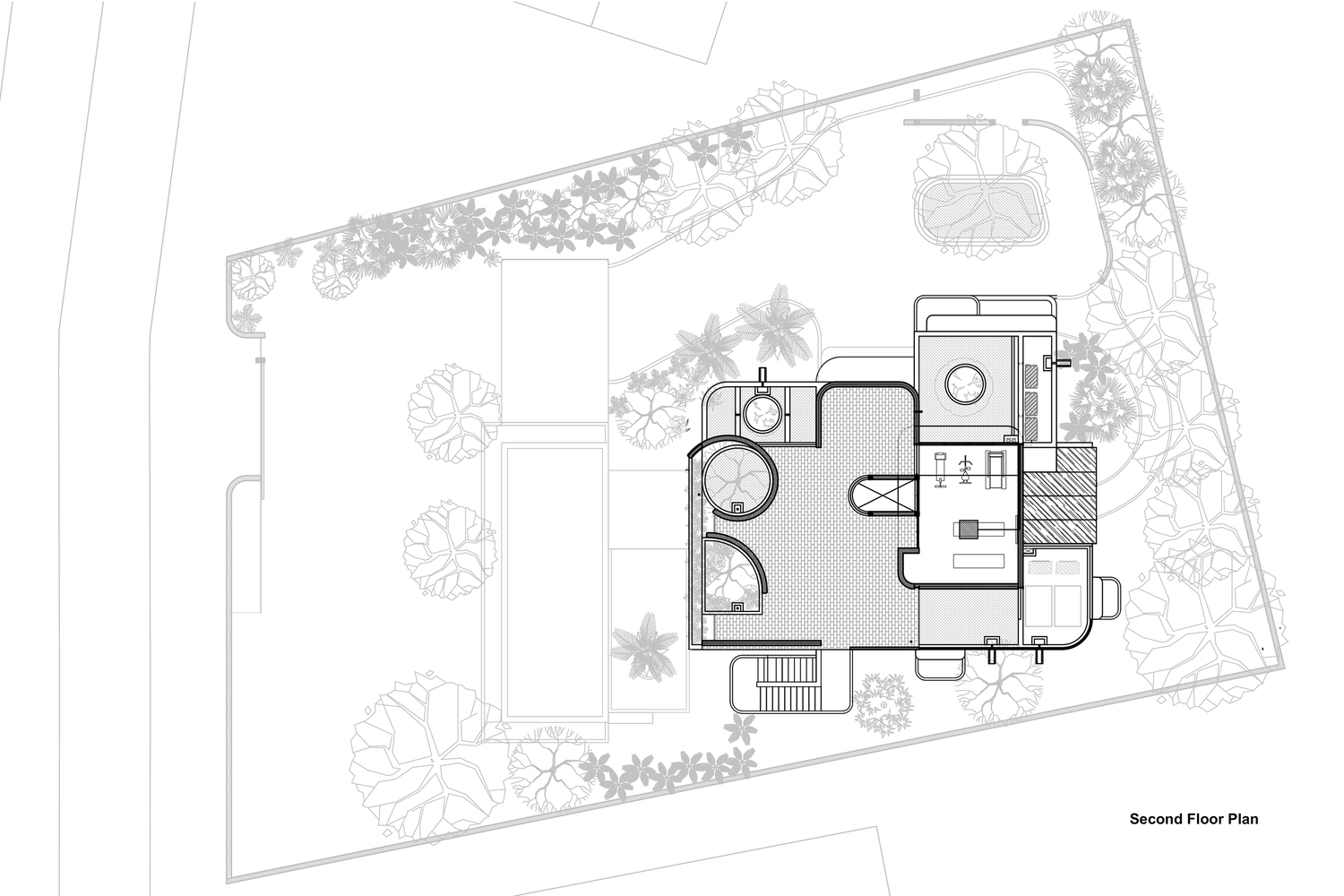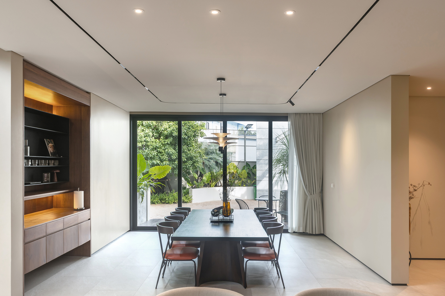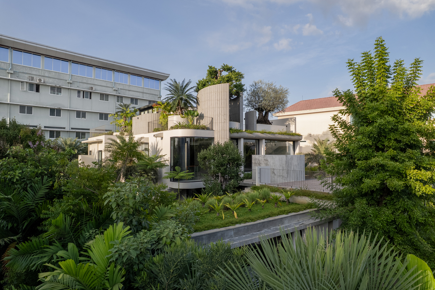 The main building is set deep within the site, leaving courtyards and gardens that help reduce noise. The lower floor hosts social spaces, service areas, leisure zones, and a guest bedroom.