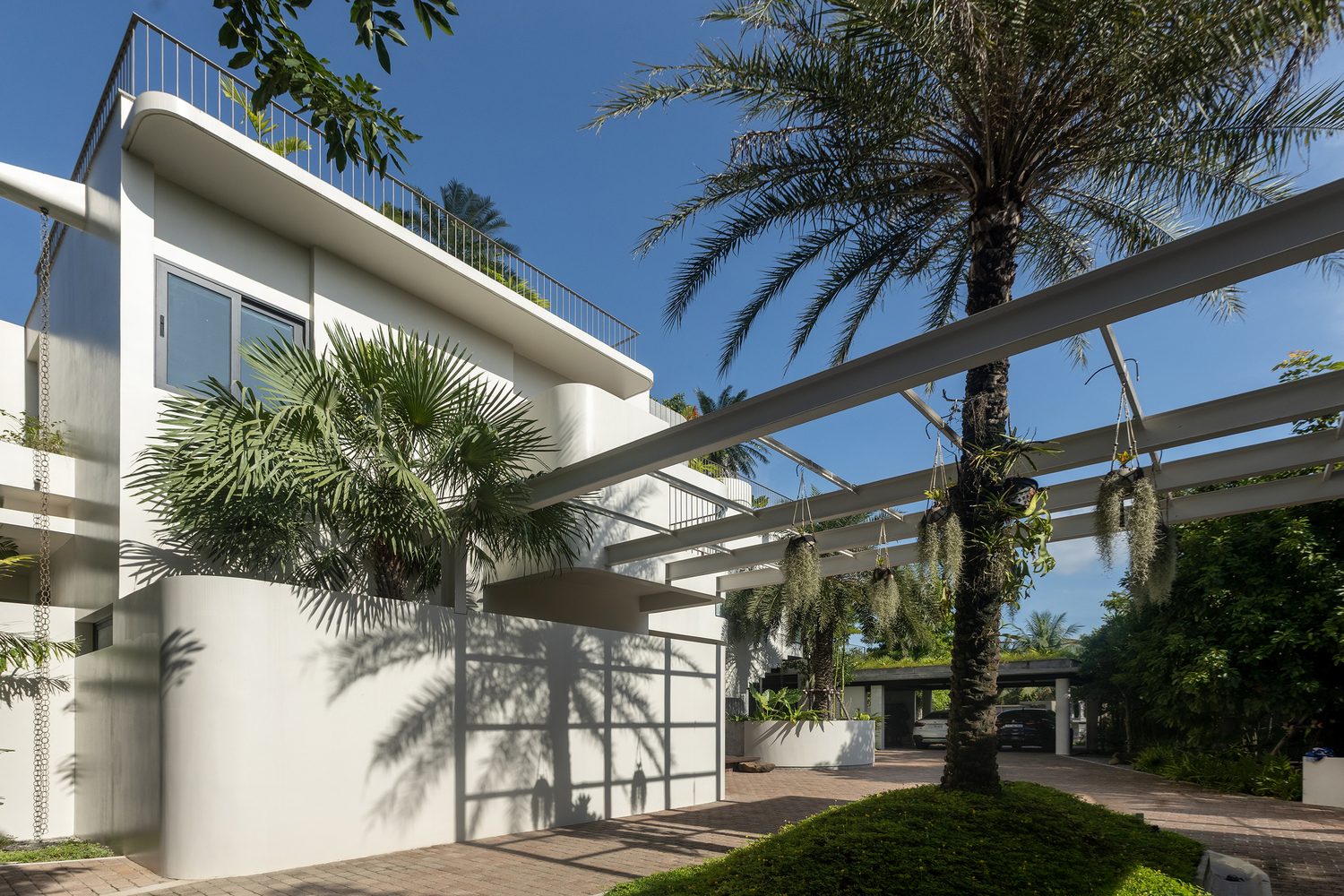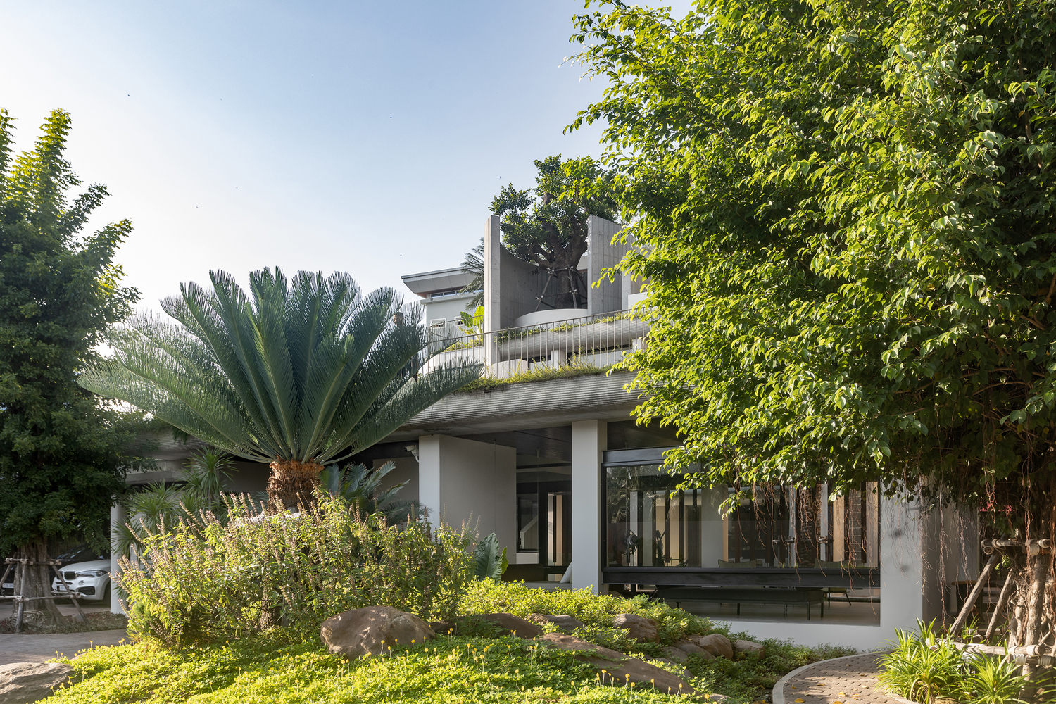 A diverse selection of trees, including wild almond, ta meng, date palm, and fan palm, along with the tranquil fishpond, deepens the home's connection to its environment.