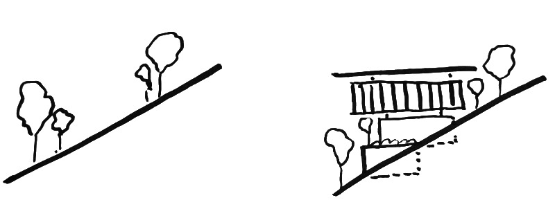 The narrow shape of the lot and its variable topography challenged us to think in levels. We created a solid horizontal base that follows the slope and supports an upper level that opens in all directions.