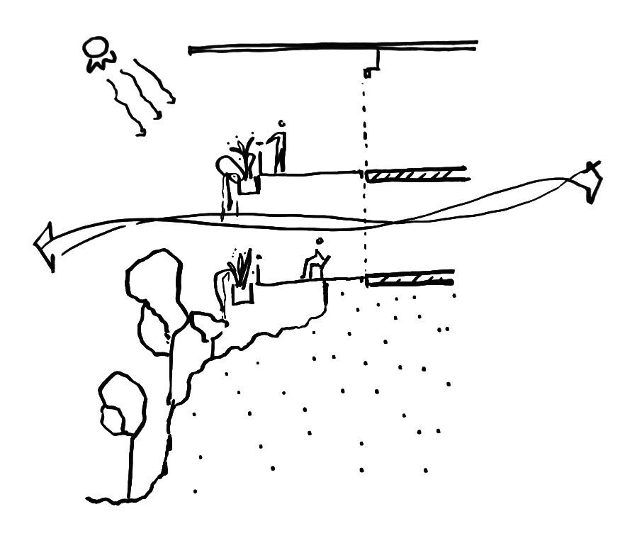 As the architecture ascends, the material palette transitions from heavier concrete and stone to lighter woods and open metal structures, reinforcing the experience of elevation.