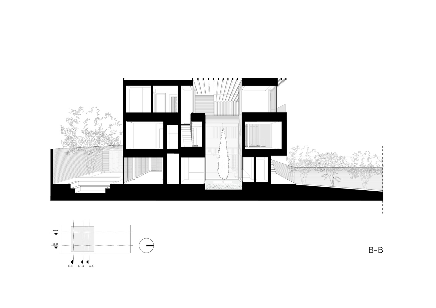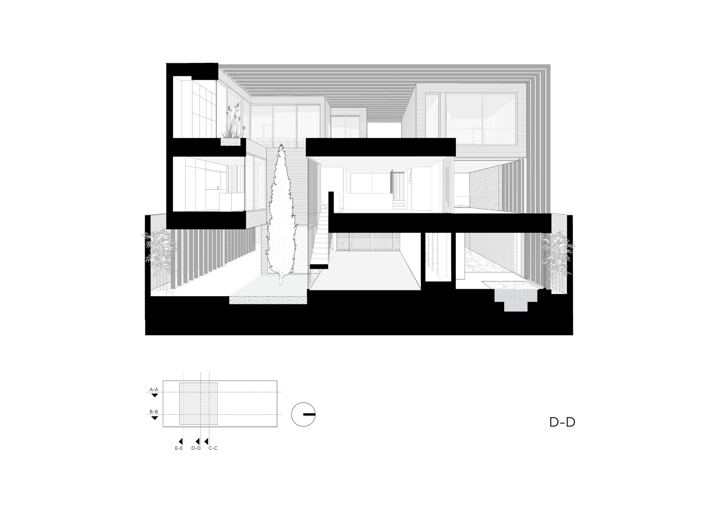 The central patio, framed as a green void, introduces a transparent and dynamic sectional experience that gently differentiates public and semi-public realms.