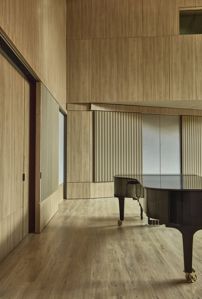 This void—more than just a simple atrium—functions as a meeting, rehearsal, and performance space, a place where sound expands freely before being contained again.
