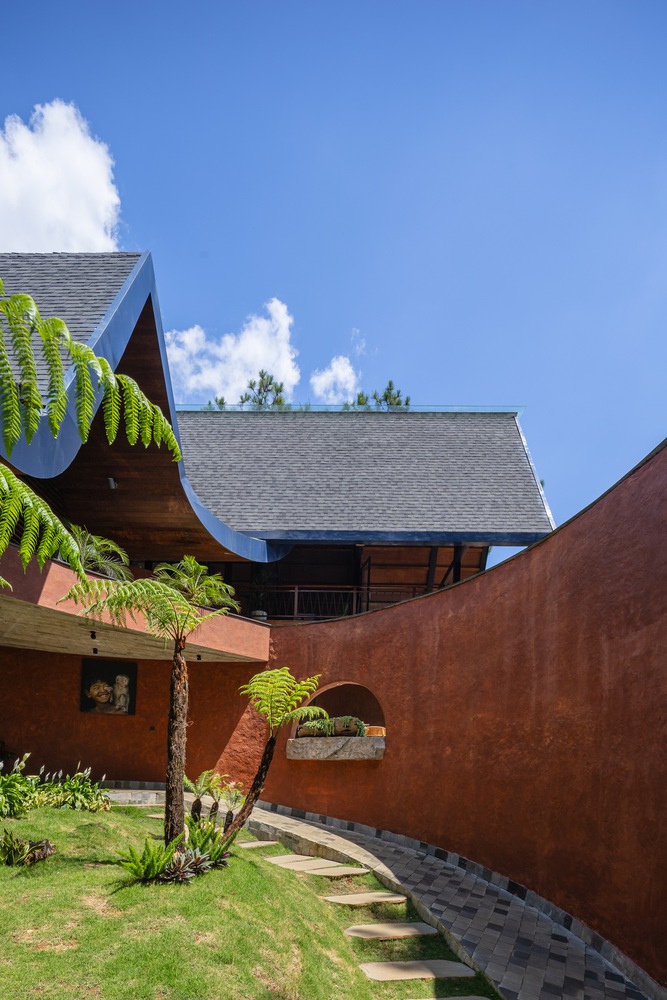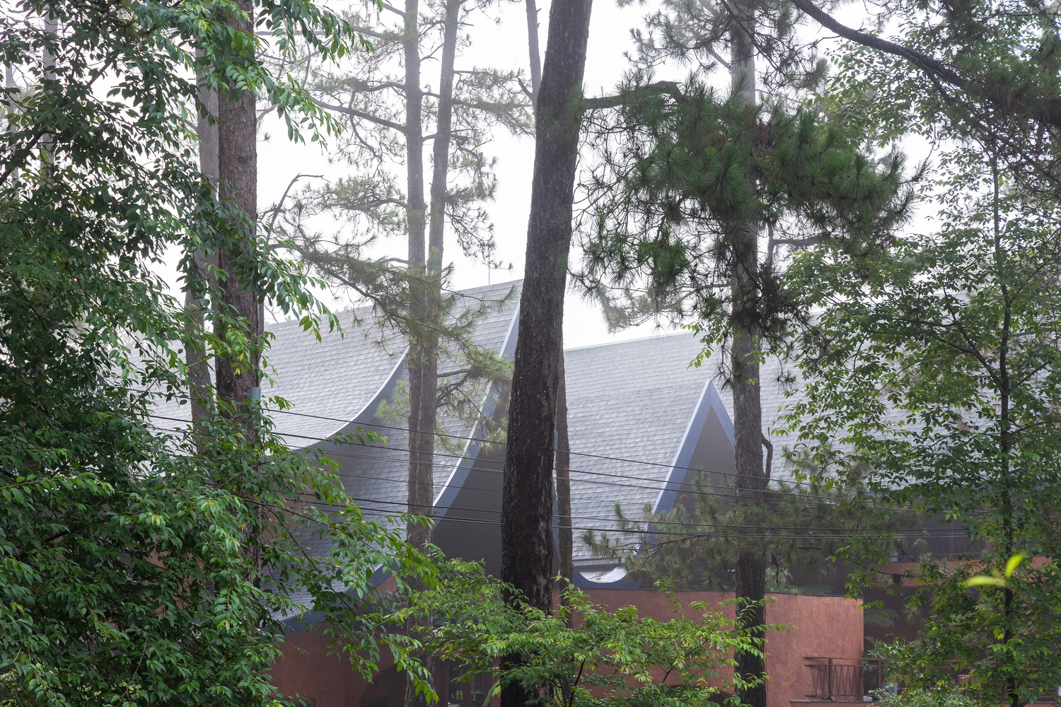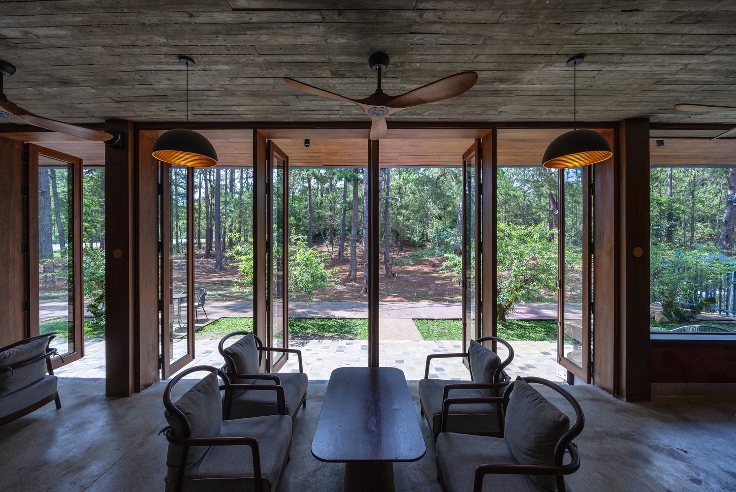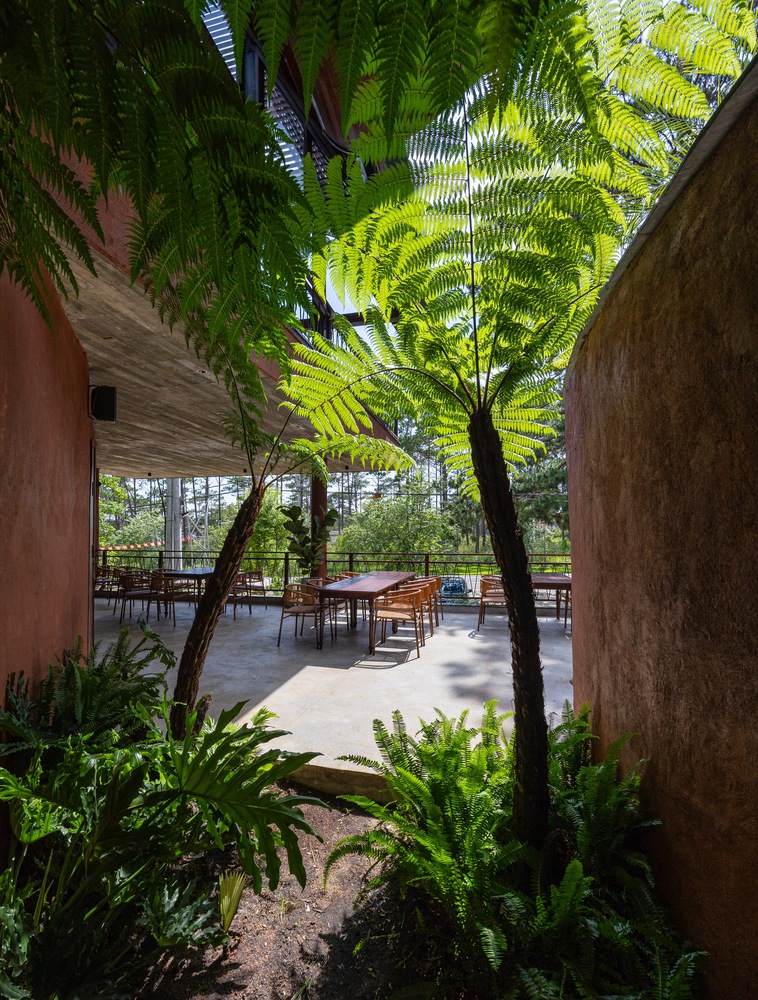 Nestled in Mang Den, the 1,000-square-meter site is embraced on three sides by untouched pine forest, a setting defined by mist, rain, and a cool highland climate that imbues the place with a serene, almost mystical atmosphere.
