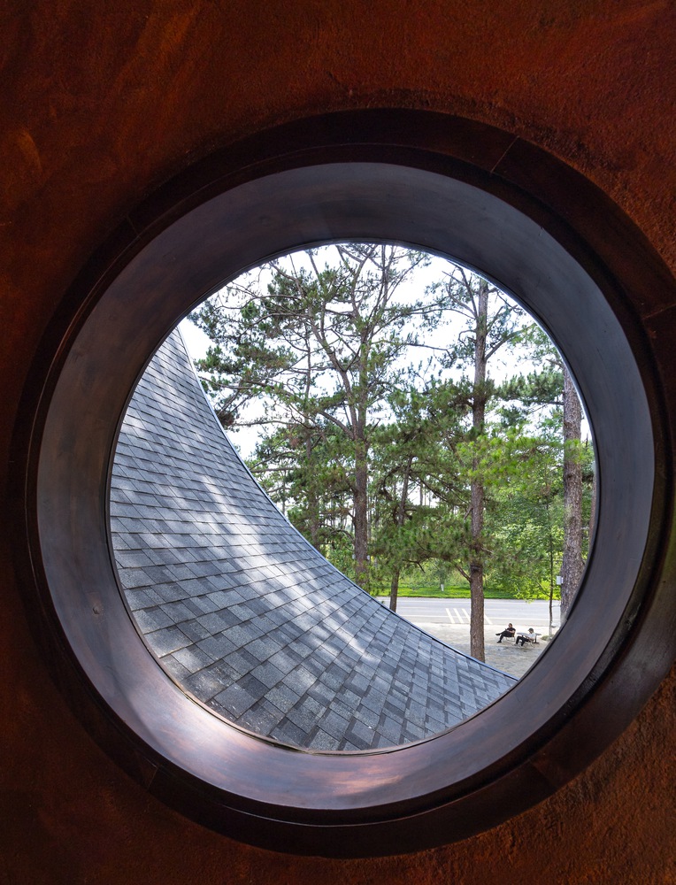 The main approach cuts through an open-air circular courtyard, establishing a gentle threshold between exterior and interior.