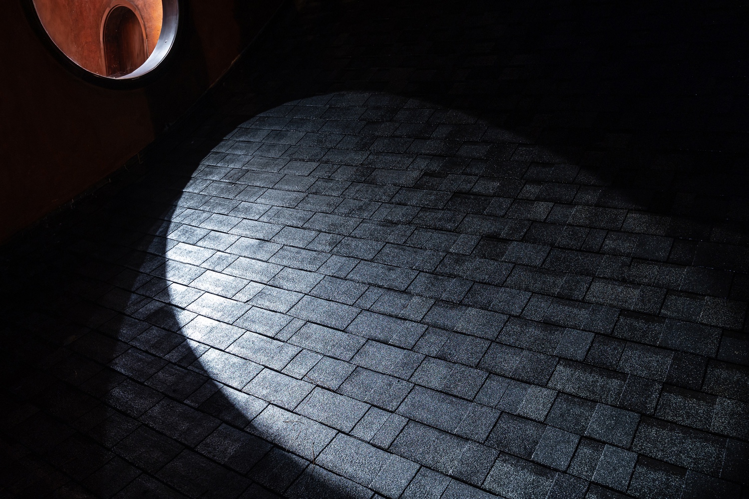 The roof structure relies on a primary steel frame, its underside lined with timber for warmth and tactility, while the outer layer is finished in lightweight, neutral-toned bitumen shingles - practical for the region's climate.
