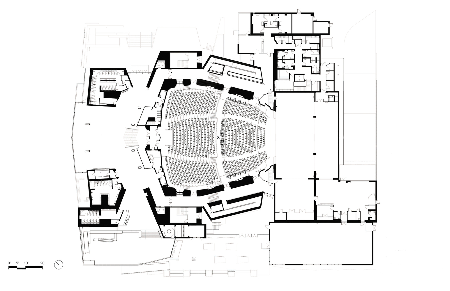 The addition of new lobbies directly engages with the sidewalk allowing pedestrians to see the activity within to showcase the arts as a community asset.