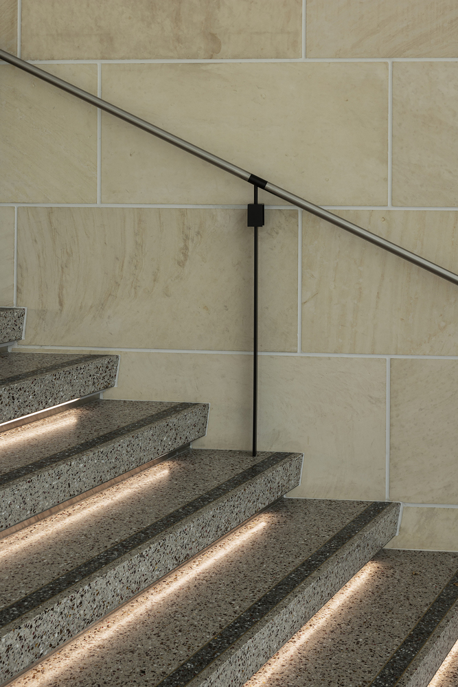 A material palette of transparency contrasts with the former façade's opaque concrete and creates a welcoming presence at the pedestrian level.