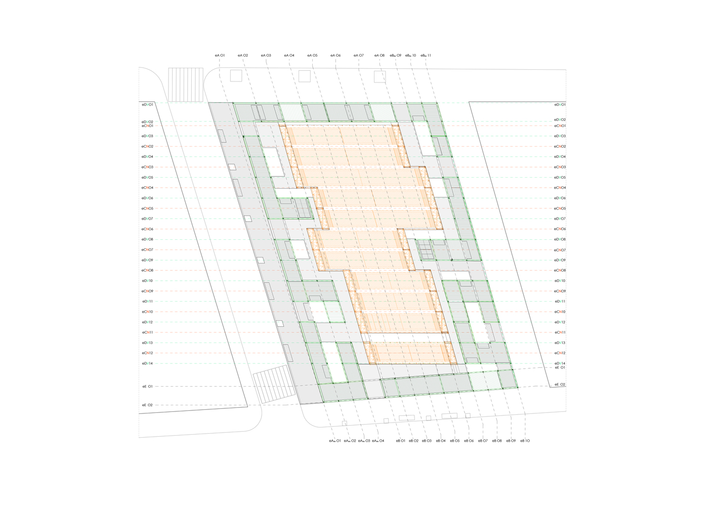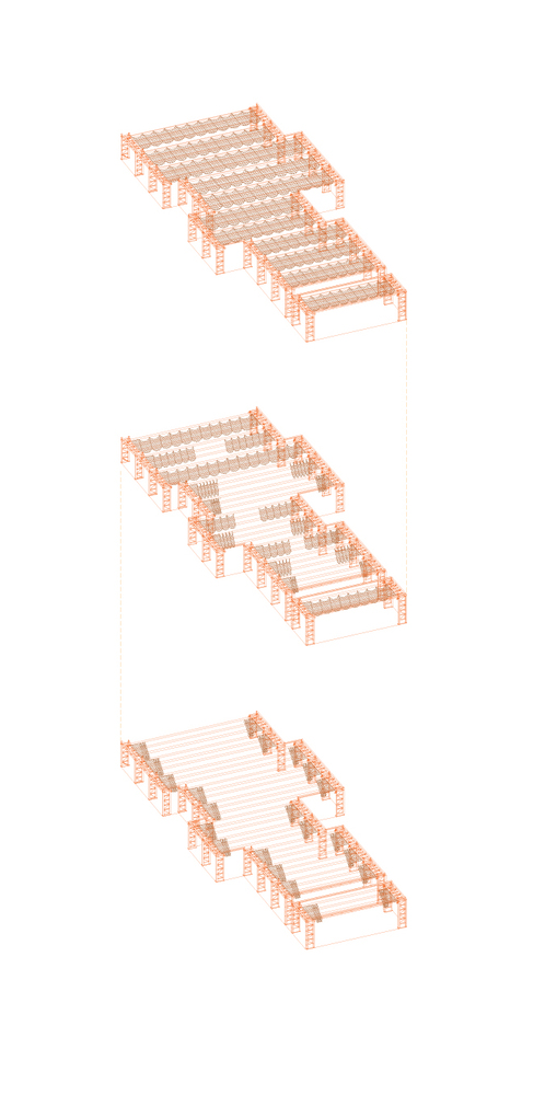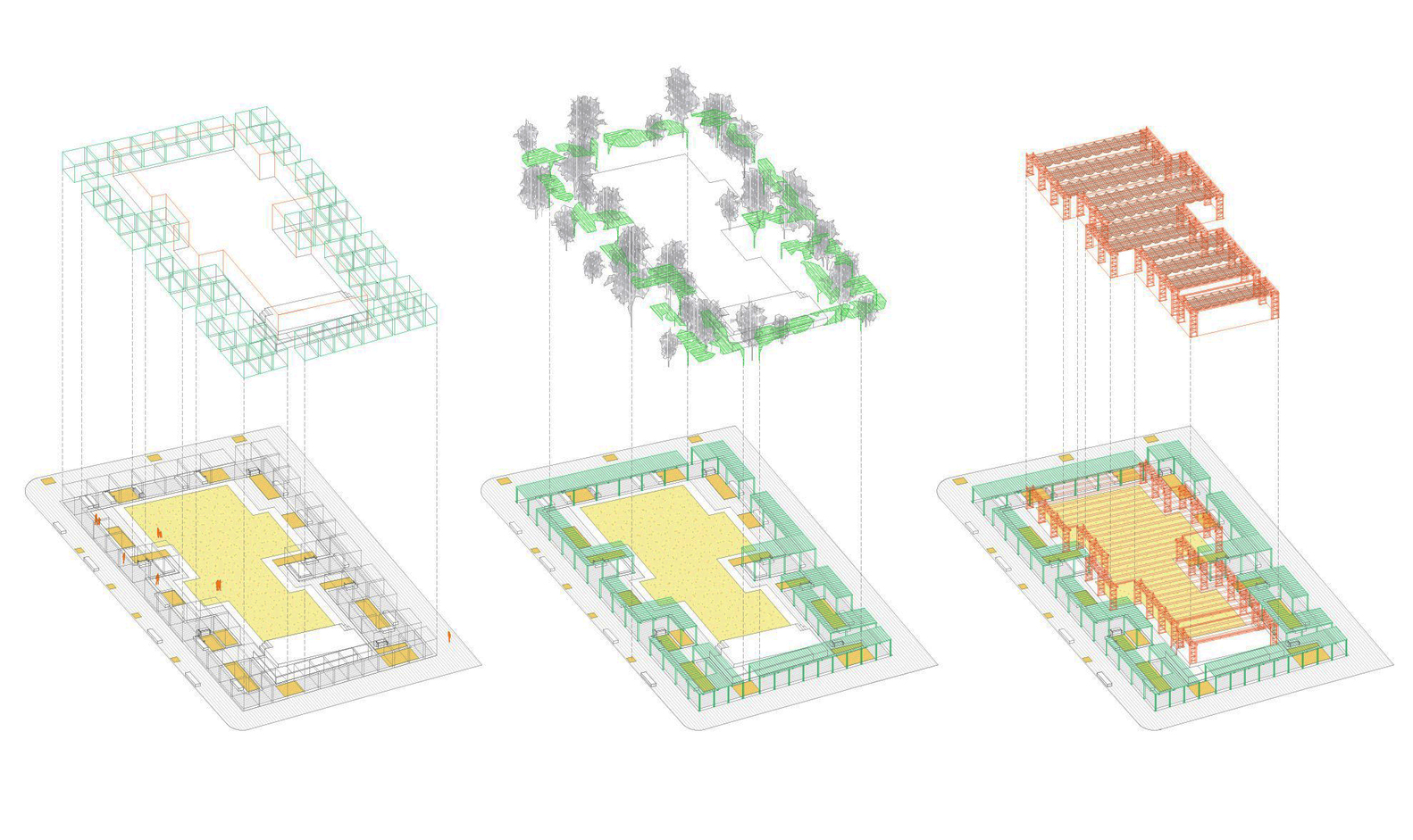 A green perimeter pergola shelters shaded, intimate, and cool areas, filled with vegetation; while a central terracotta pergola forms a collective and infrastructural heart—a scenic void open to multiple urban activities.Beneath the tectonic world of the pergolas unfolds a stereotomic landscape, sculpted from the ground plane.