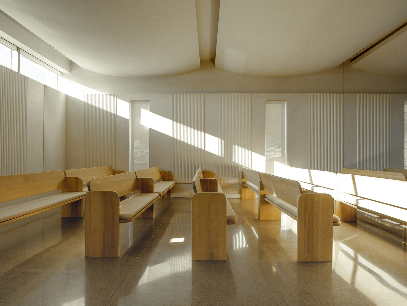 The programmatic expansion includes a meditation room with a skyward view designed for ceremonies, a large meeting room that can be subdivided according to need, family lounges, private consultation rooms, a play area for children, and a new columbarium that doubles the existing capacity.