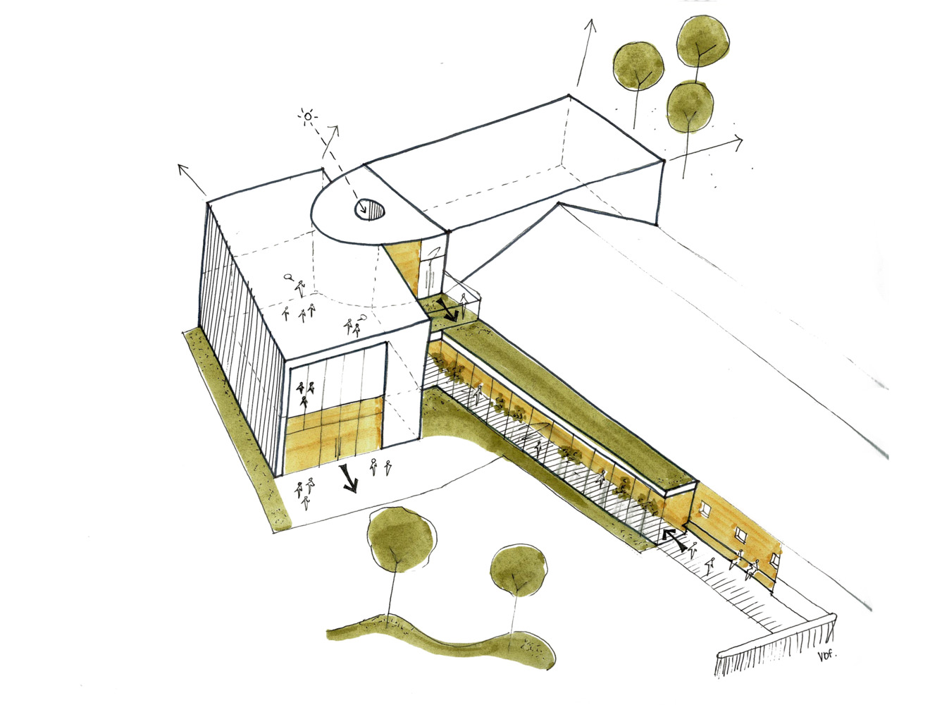 Lined with full-height windows and punctuated by interior gardens, this luminous corridor becomes the backbone of the project, subtly guiding visitors toward the heart of the extension.