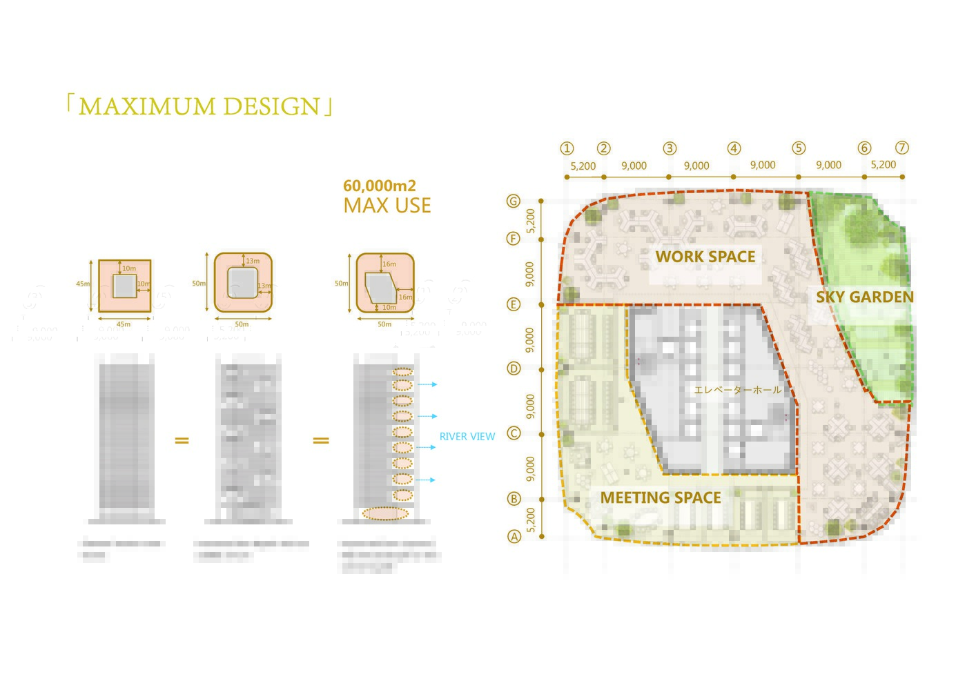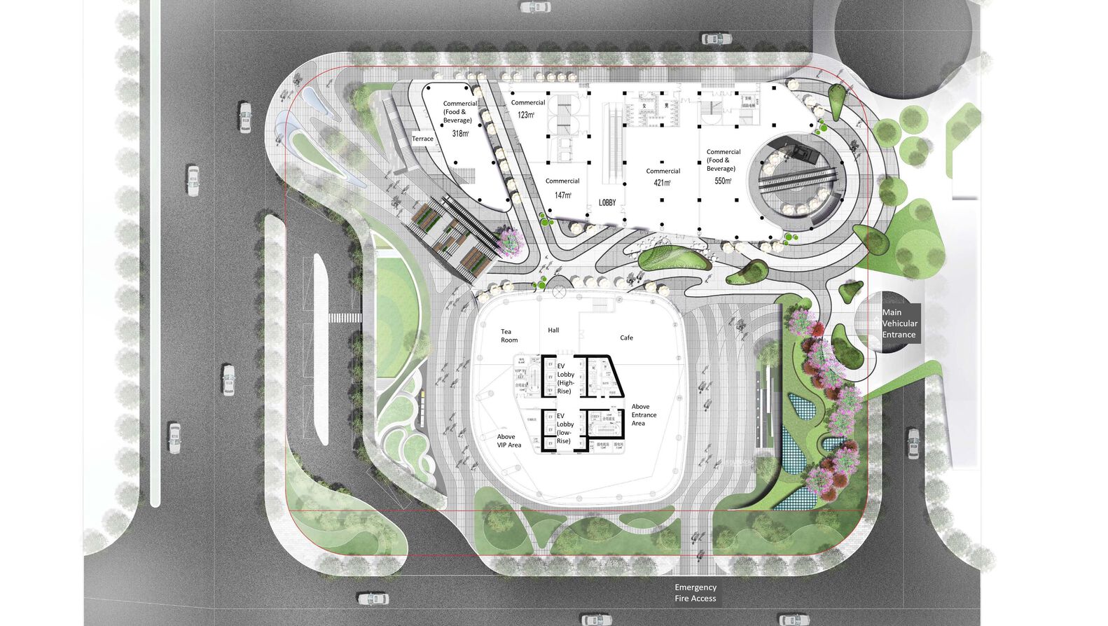 This supertall building is designed to delight people from near, medium, and far distances. From a distant view, we focused on the city's appearance and its distinctive skyline, while from a medium view, we emphasized the layout plan and building's appearance as experienced on site. In the foreground, particular effort was put into the functions and details created by the building's dynamic form."