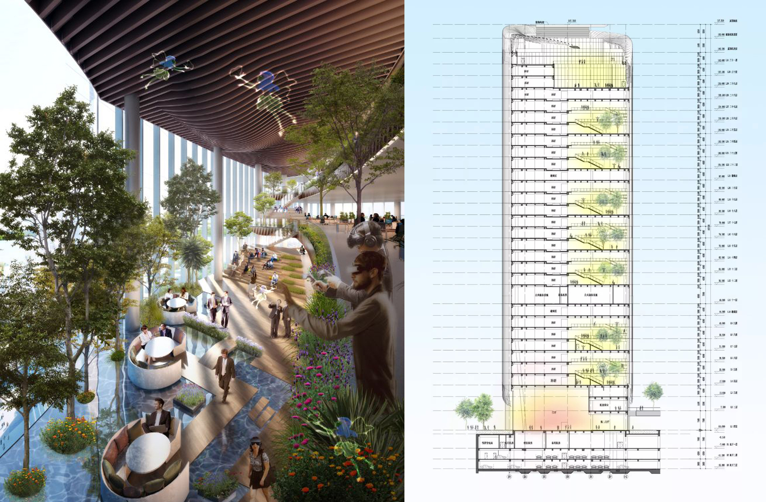 In this project, we aimed to create open and sustainable architecture that takes advantage of Shanghai's warm climate. Compared to conventional high-rise buildings with closed, fully air-conditioned, energy-consuming systems, this building has many non-air-conditioned indoor and outdoor areas.