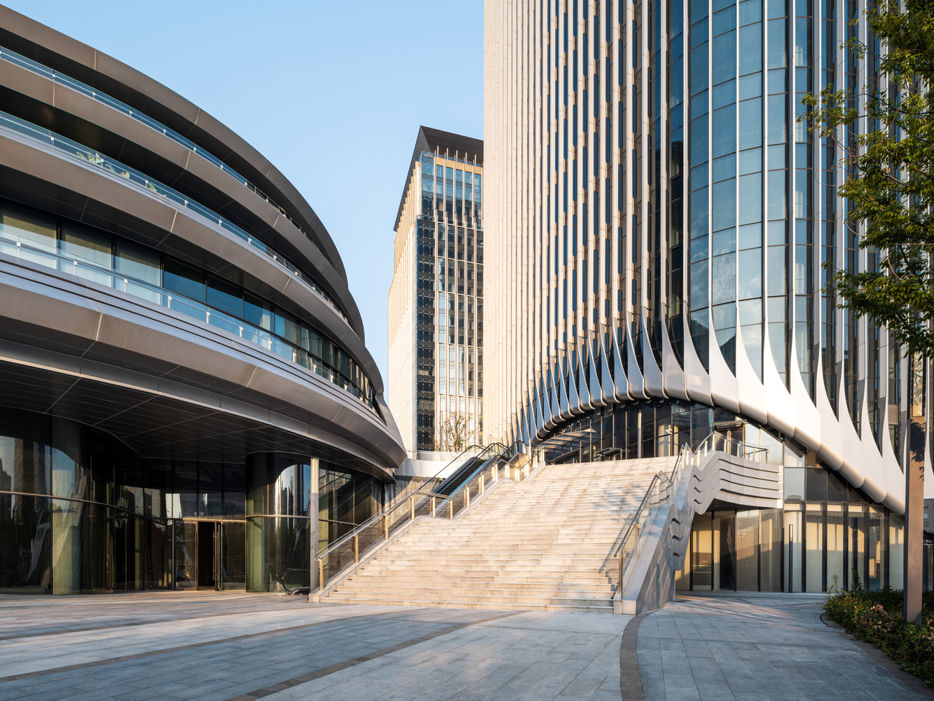 The 9-meter elevation difference in the entrance facade features a generous 1.5-meter-wide overlapping wing design that embodies the building's "people friendliness."
