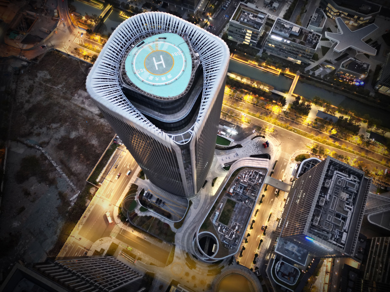 The building is not a "closed structure" per se; its two external rooftop terraces allow access to the outside. Additionally, it connects to air routes via a helipad, opening the building's architecture toward the sky.