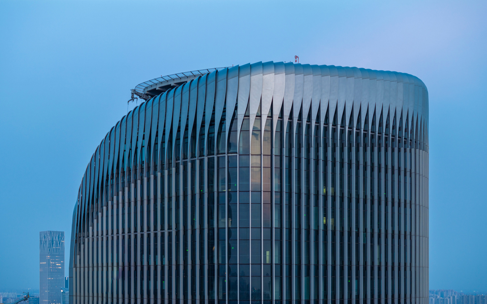 Among the skyscrapers in this area, it forms a particularly soft skyline. The fins that cover the building's structure and extend to the top are louvers that alter their configuration and appearance depending on the angle of the sunlight at different times of the day. They are arranged in a 130-meter radius arc.