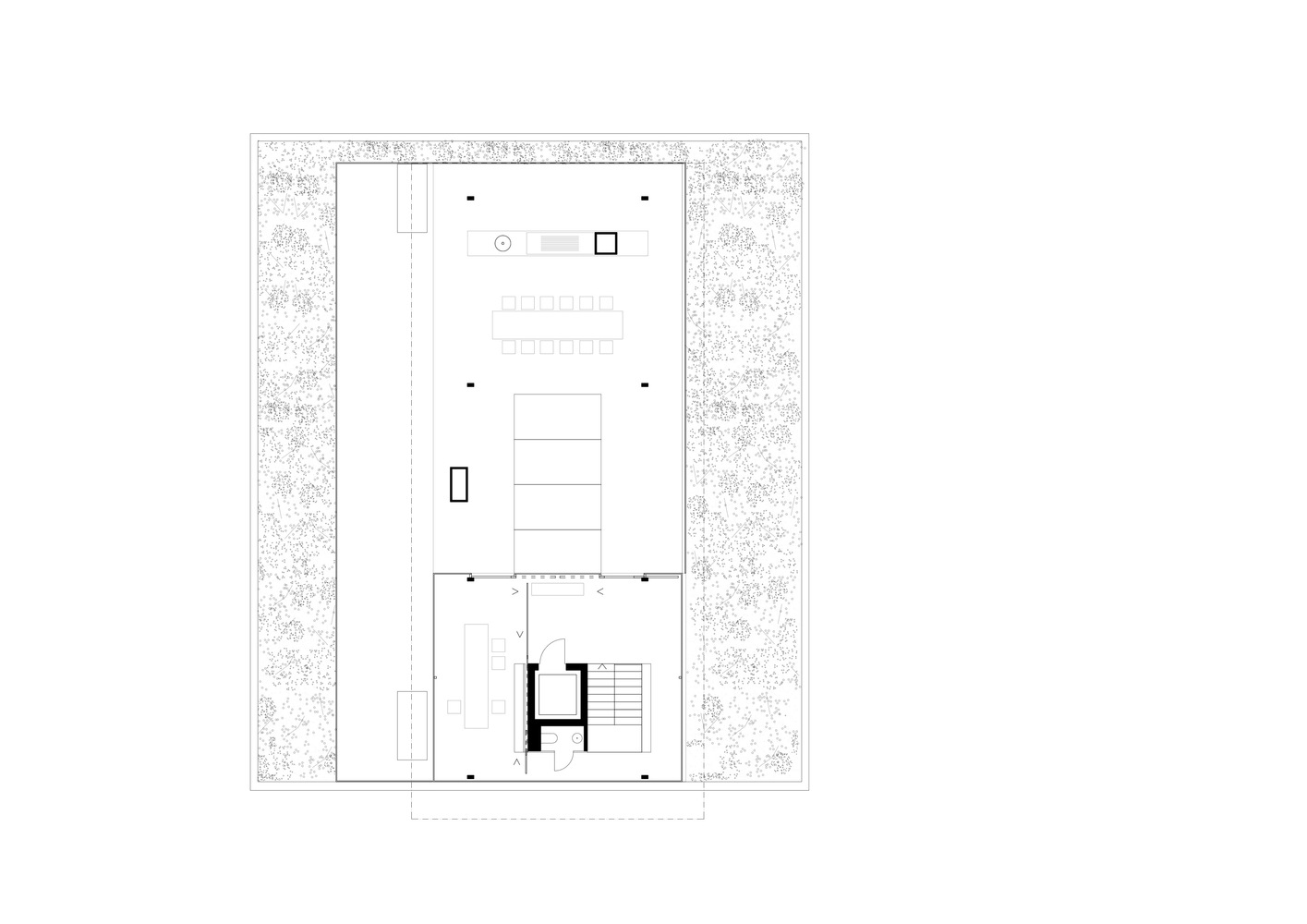 It is the largest by floor area and forming masonry pedestal of the house. Glazed main living space, which is situated on it, is full of natural light and surrounded on all sides by mature trees.