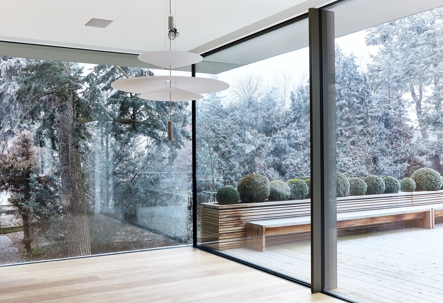 Both of these massive blocks of well-balanced proportions and horizontal corner windows, designate the living space which opens up towards exterior separated only by glazing.