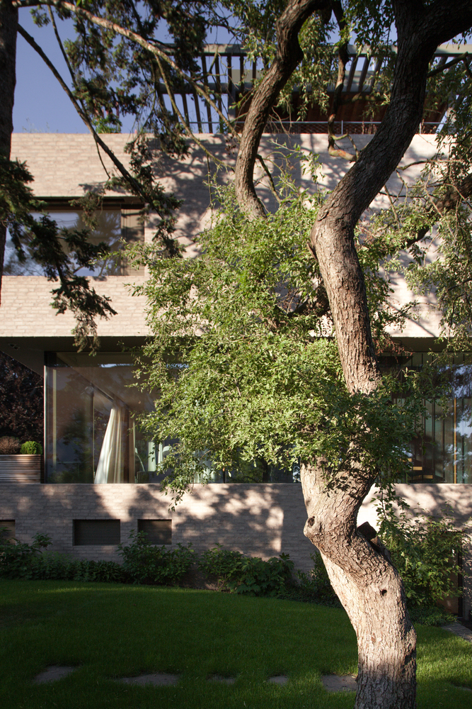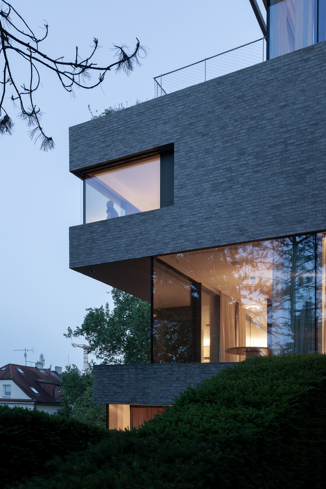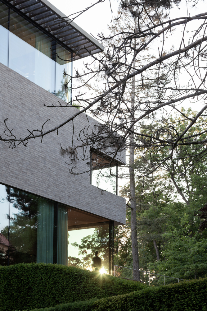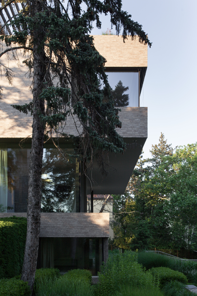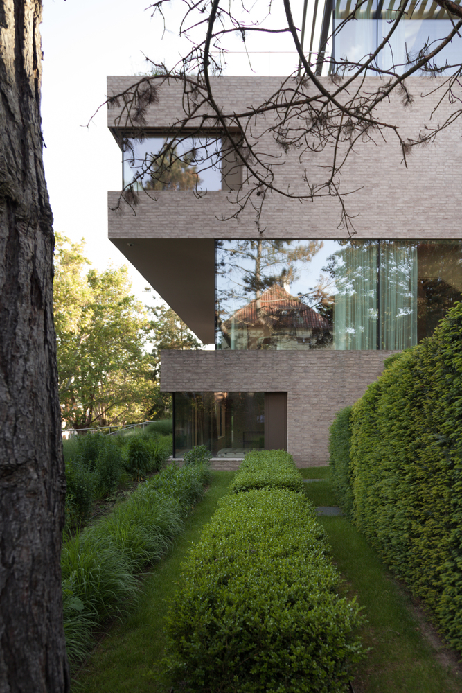 The concept of layering of solid and hollow volumes, simple geometry and submerging into the sloping terrain, lightens the whole impression of a 5-storey mansion.