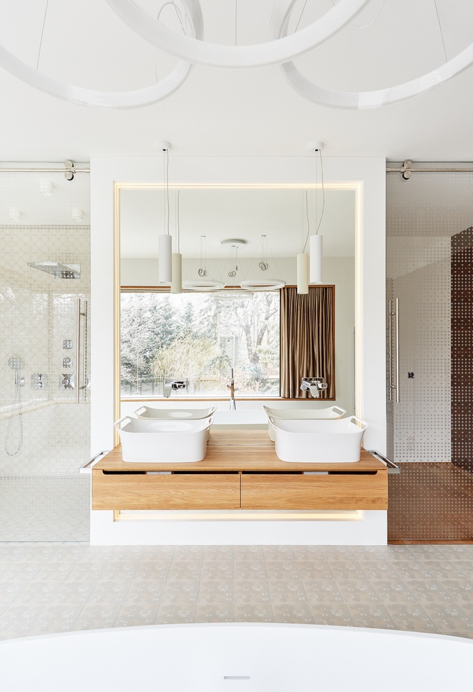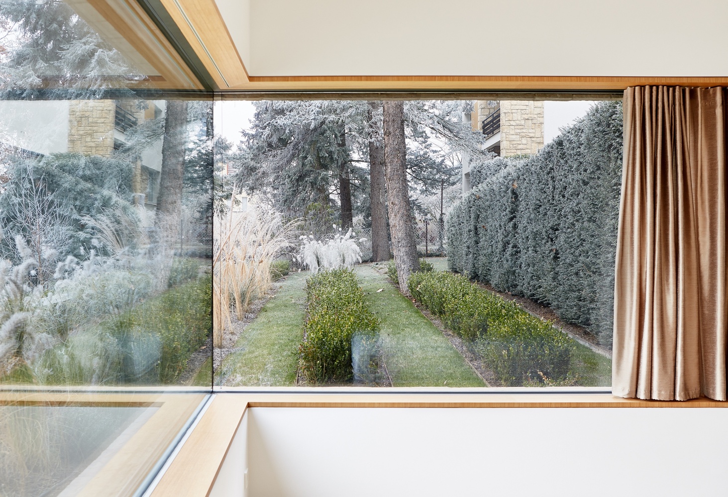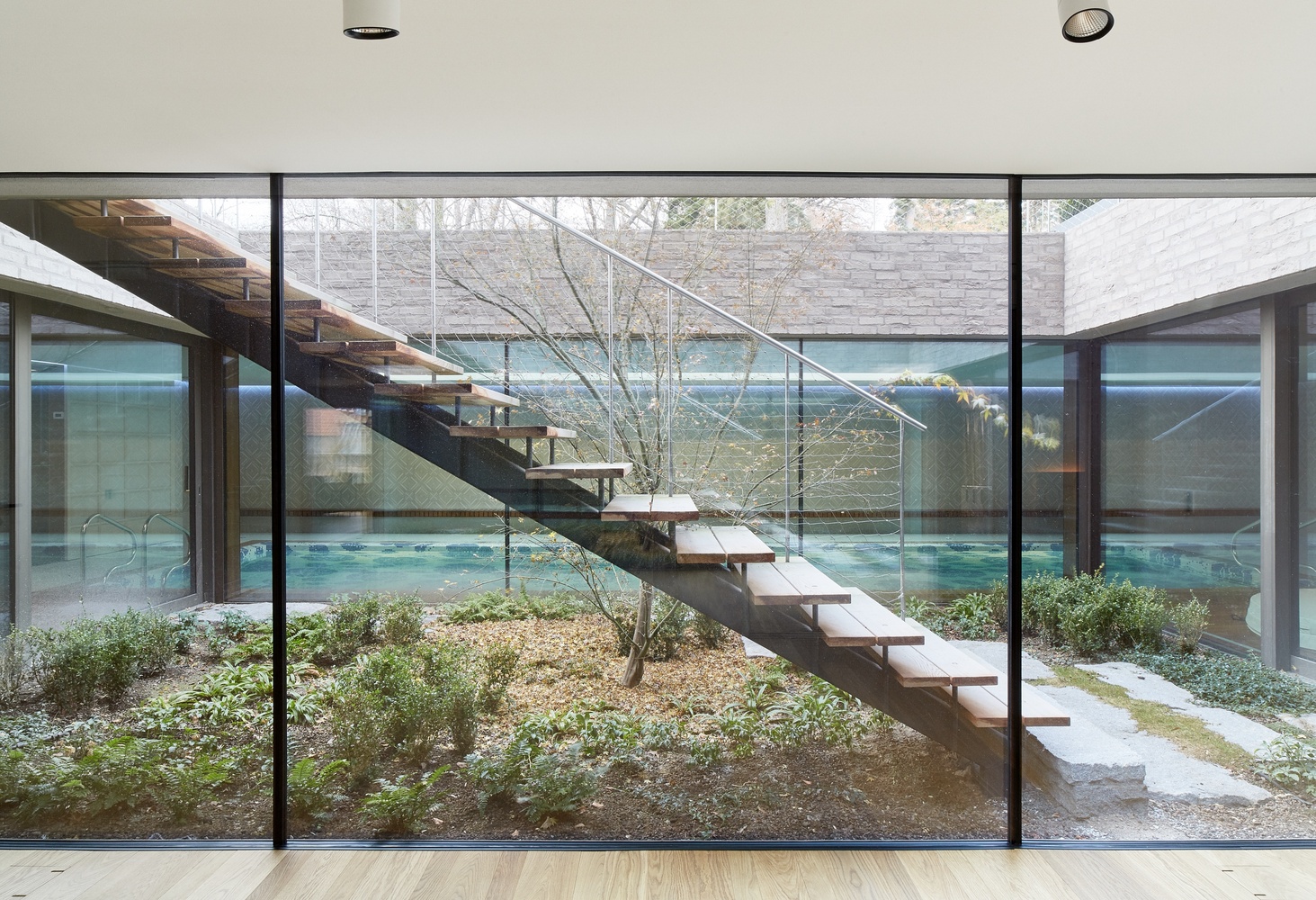 The concept of layering of solid and hollow volumes, simple geometry and submerging into the sloping terrain, lightens the whole impression of a 5-storey mansion.