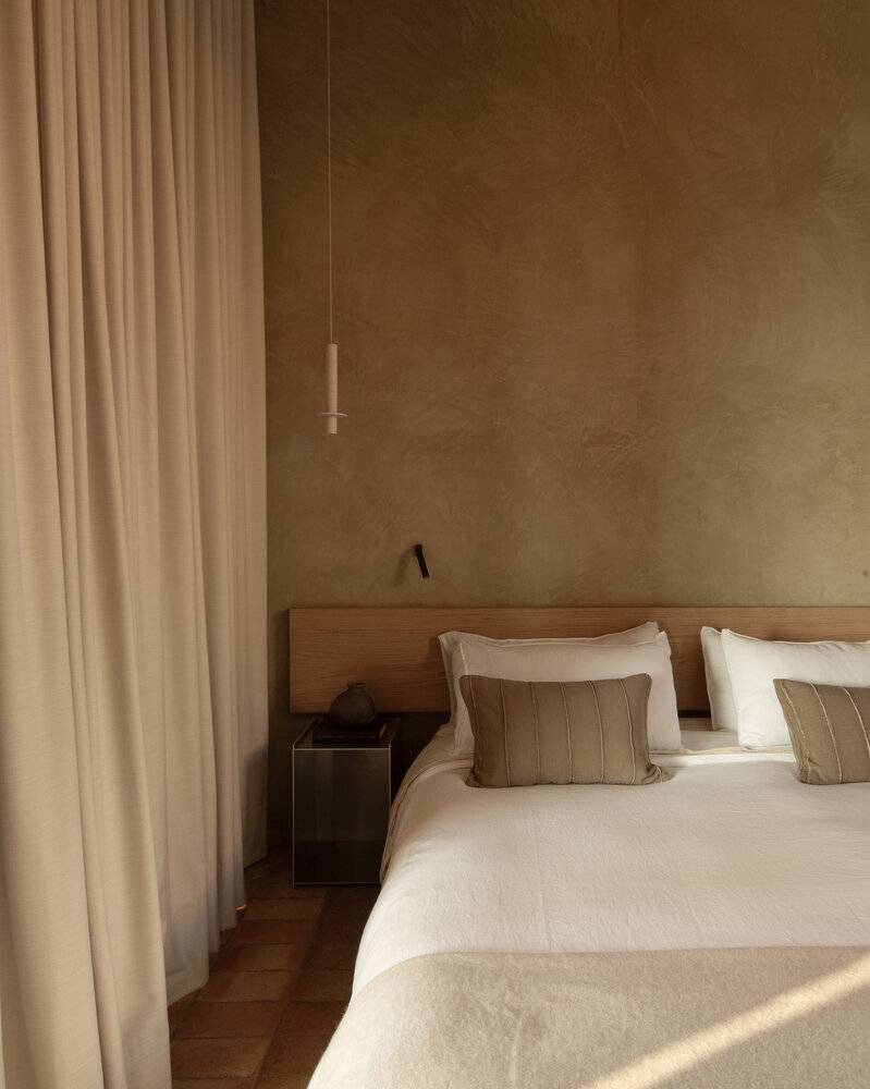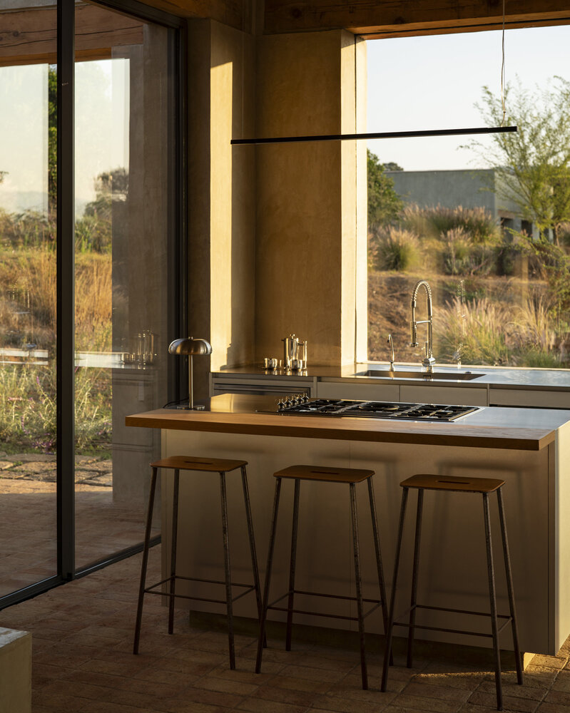 The floor was handcrafted with adobe produced on-site, and the walls are finished with an adobe plaster that harmonizes with the surrounding color palette.