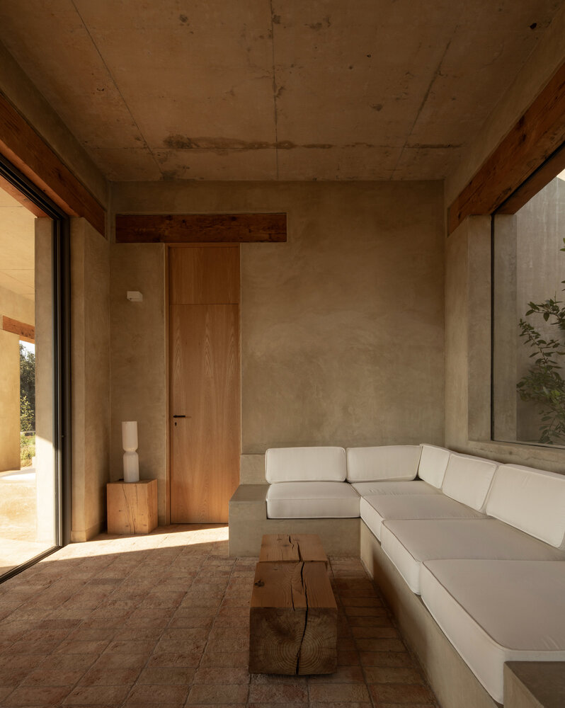 The structure combines adobe and wooden beams, which were left exposed to add warmth.