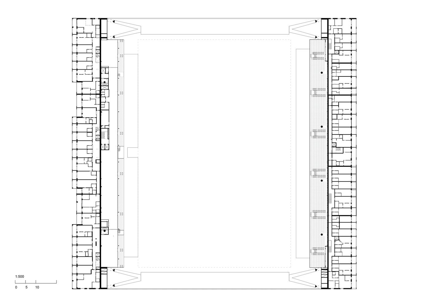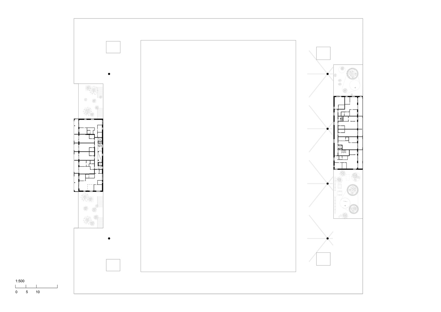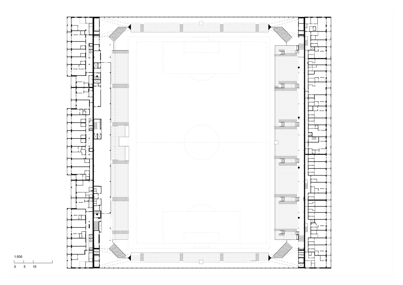Their courtyards are elevated to the roof levels between the masses. In the compact football pitch, the stands rise immediately from the edges of the pitch.