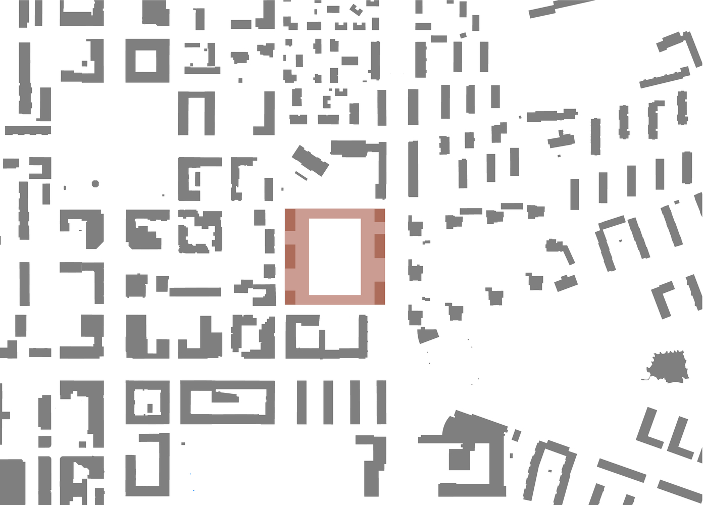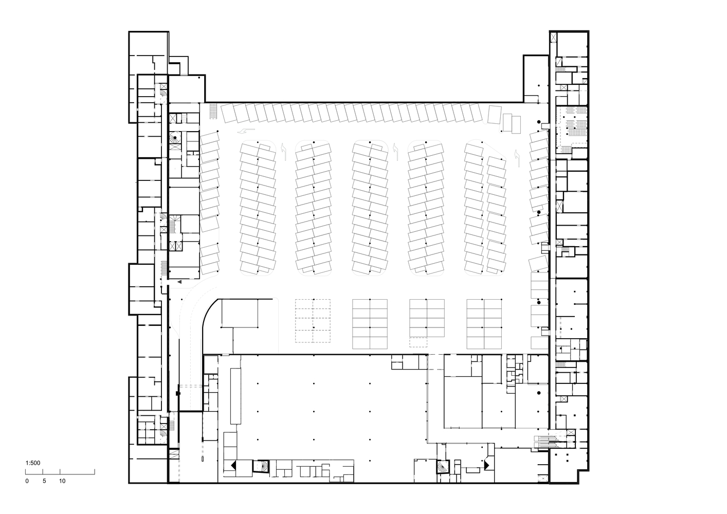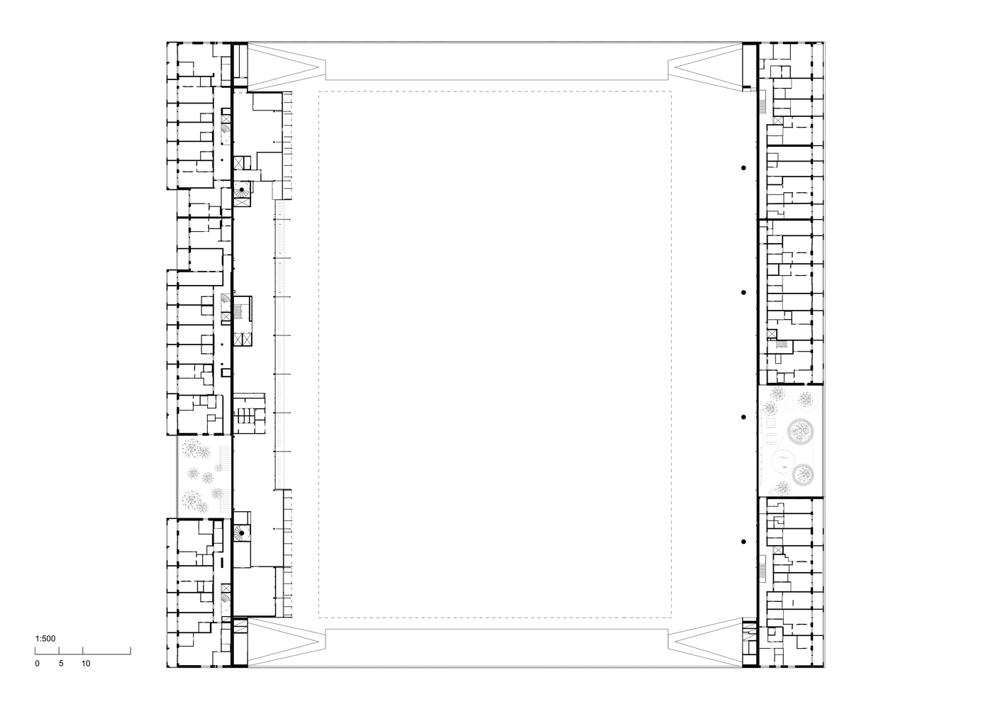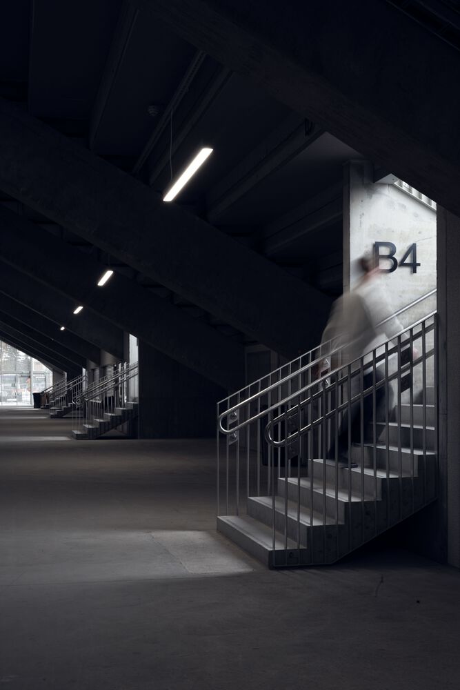 Their courtyards are elevated to the roof levels between the masses. In the compact football pitch, the stands rise immediately from the edges of the pitch.