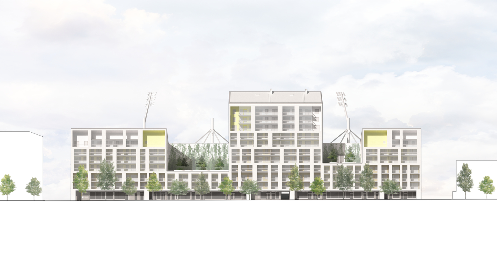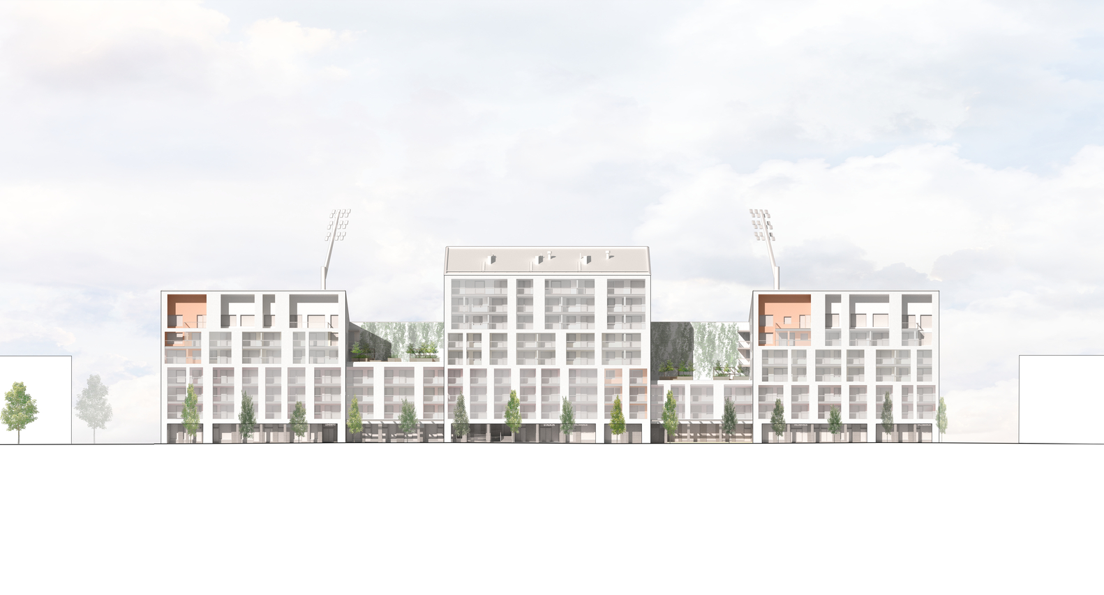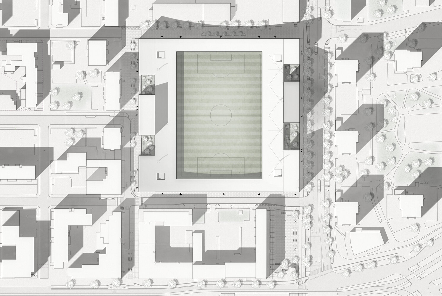 The stadium is part of a nearly 50,000 square meter hybrid block, complementing the urban structure, which consists of eight interconnected plots, including the football stadium, five residential buildings, a commercial centre, and parking facilities.