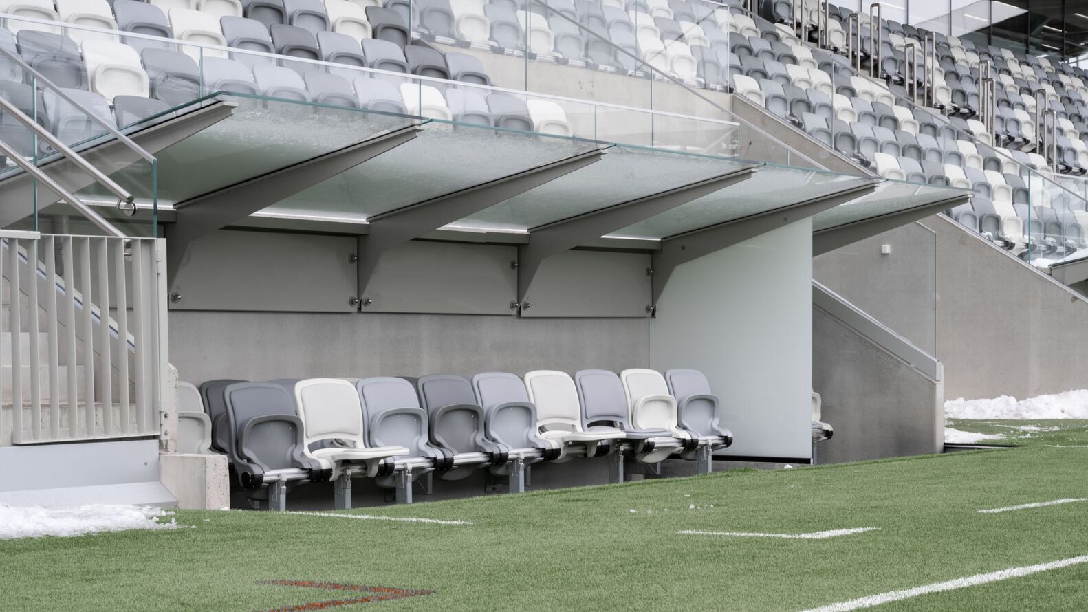 The main stand is situated on the eastern edge of the pitch, and the restaurant, VIP, and press stands are on the western edge. During the design phase, an additional spectator seats were added above the main stand, allowing the stadium to meet the UEFA category 4 requirements.