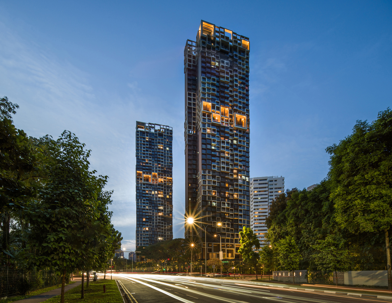 Taking as a base the highly efficient, prefabricated, modular building design by Singapore-based ADDP Architects, MVRDV's variegated façade adds liveliness to the buildings' external appearance and highlights the green communal spaces on the buildings' 24th floor and roof.