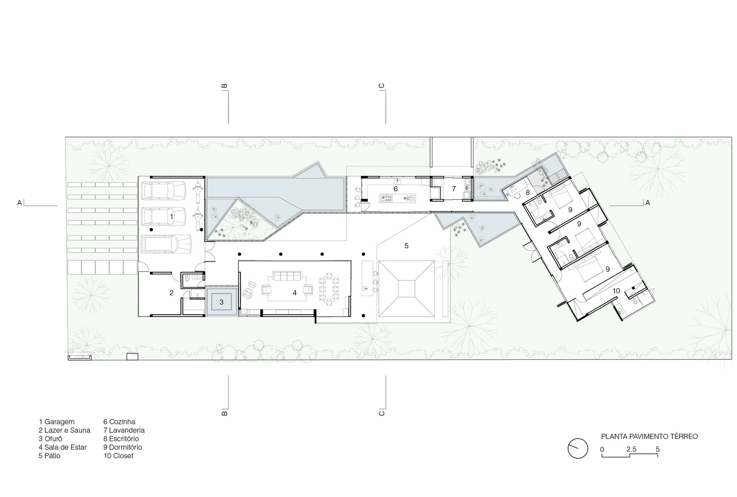 Viewed from above, the house can be interpreted as a large slab that traverses the land like a canopy of irregular geometry, shaped by the arrangement of the spaces.