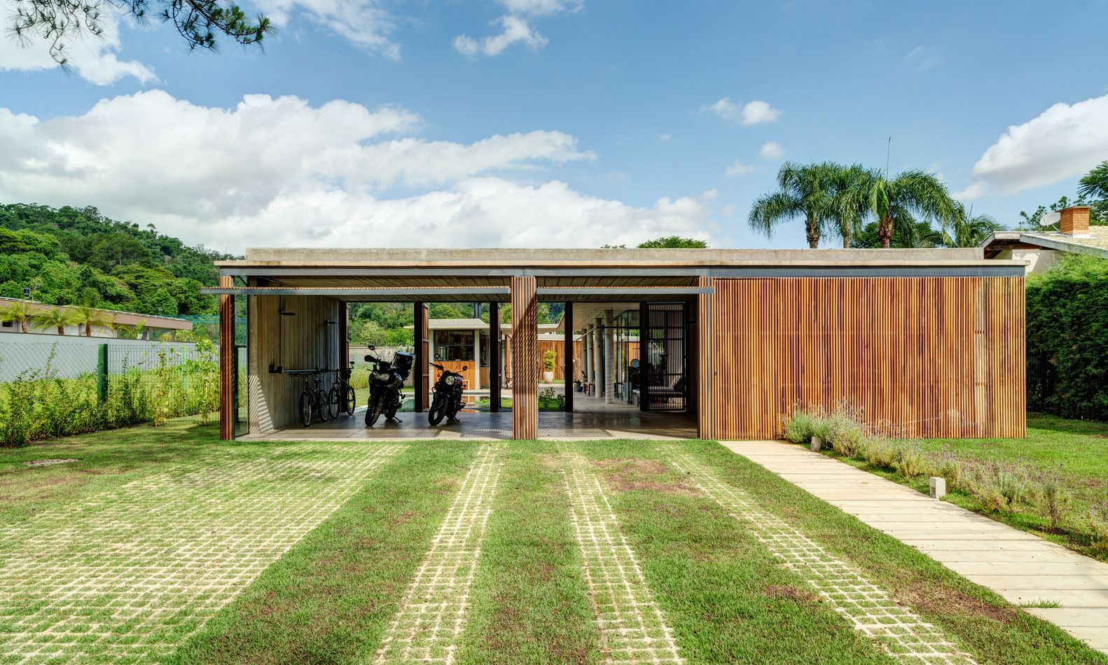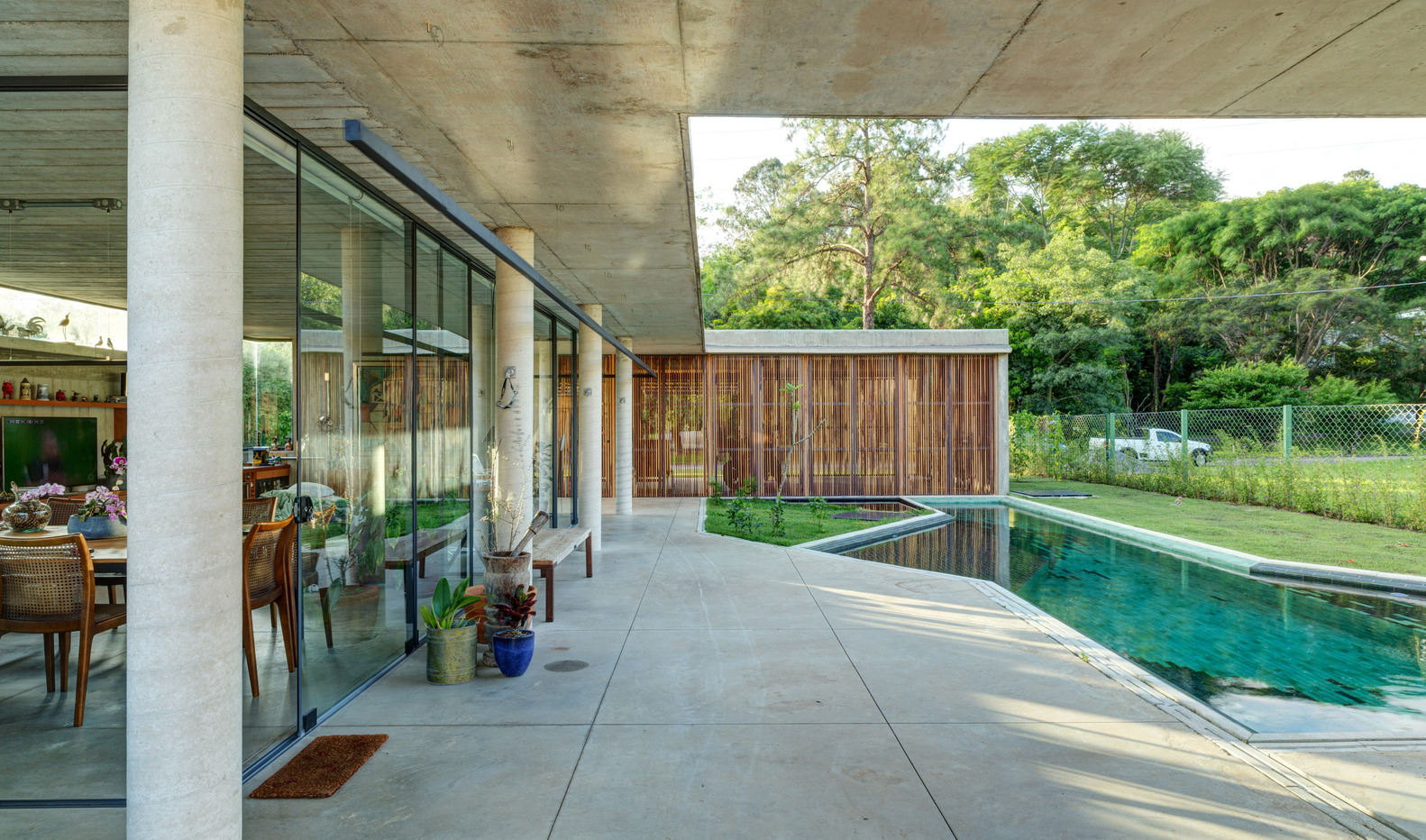 This continuous covering organizes the ensemble, alternating between closed and open spaces — pool, patio, and external living areas — to favor a fluid transition between the parts.