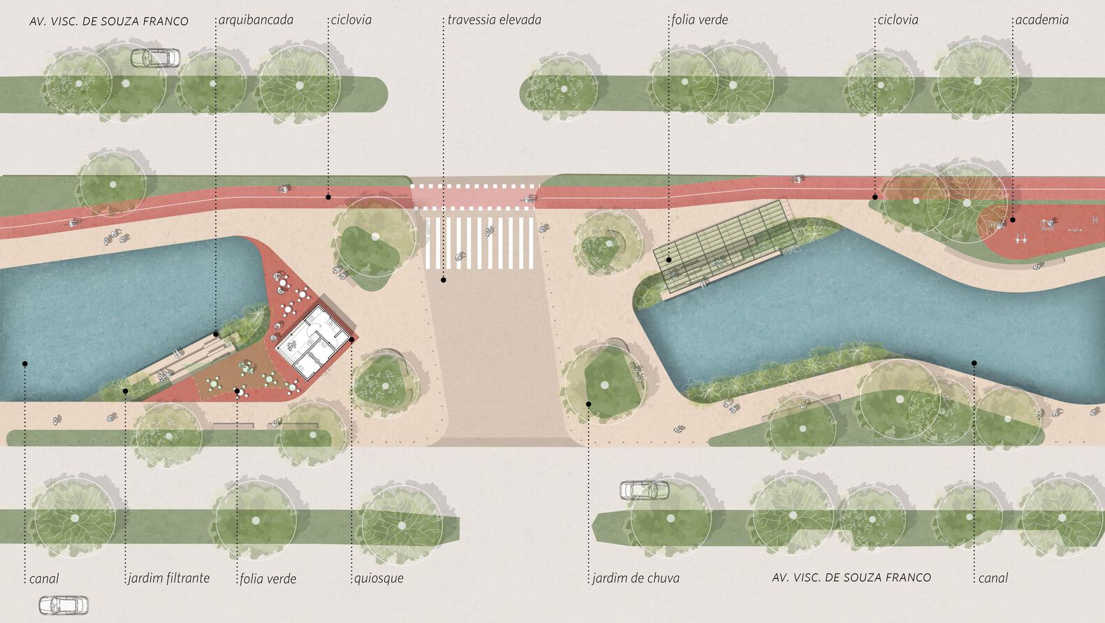 Established over the old Igarapé das Almas — now a canal about 1.2 km long in the central median of Avenida Visconde de Sousa Franco — the project recaptures the hydric identity that historically structured the Reduto basin and which, throughout the urbanization process, has been buried under fragmented and functional logics.