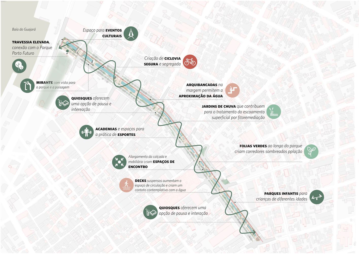 Ecological and urban regeneration strategy. The transformation of the old igarapé into a linear park relies on a robust set of environmental, hydraulic, and landscaping solutions: