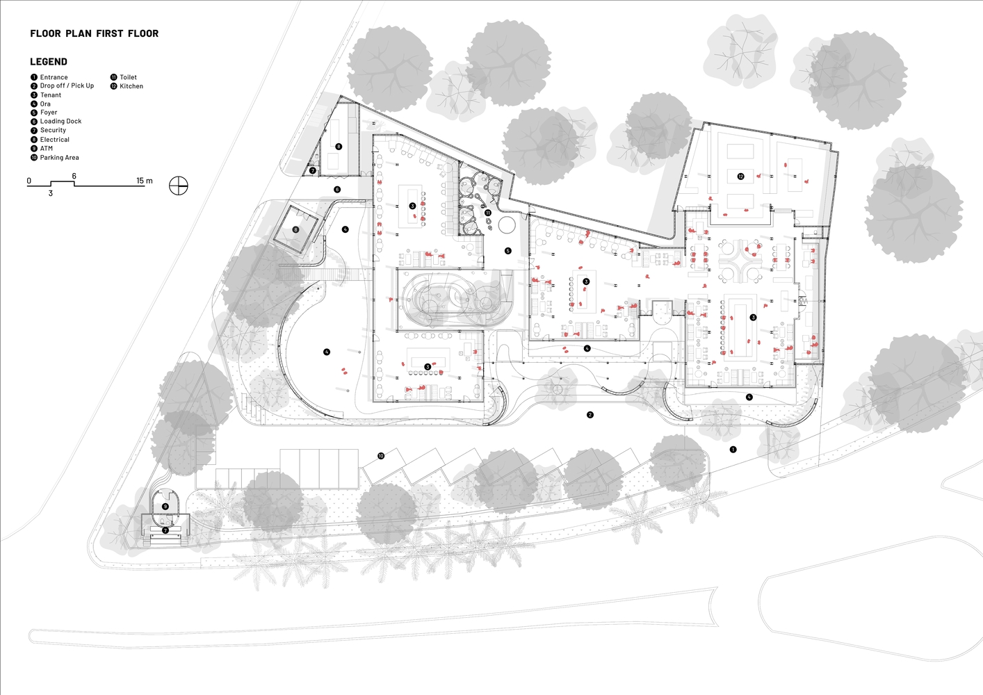 Rather than treating landscape as a supplement to architecture, the process was reverse-engineered: the massing was generated around the preserved tree zones.
