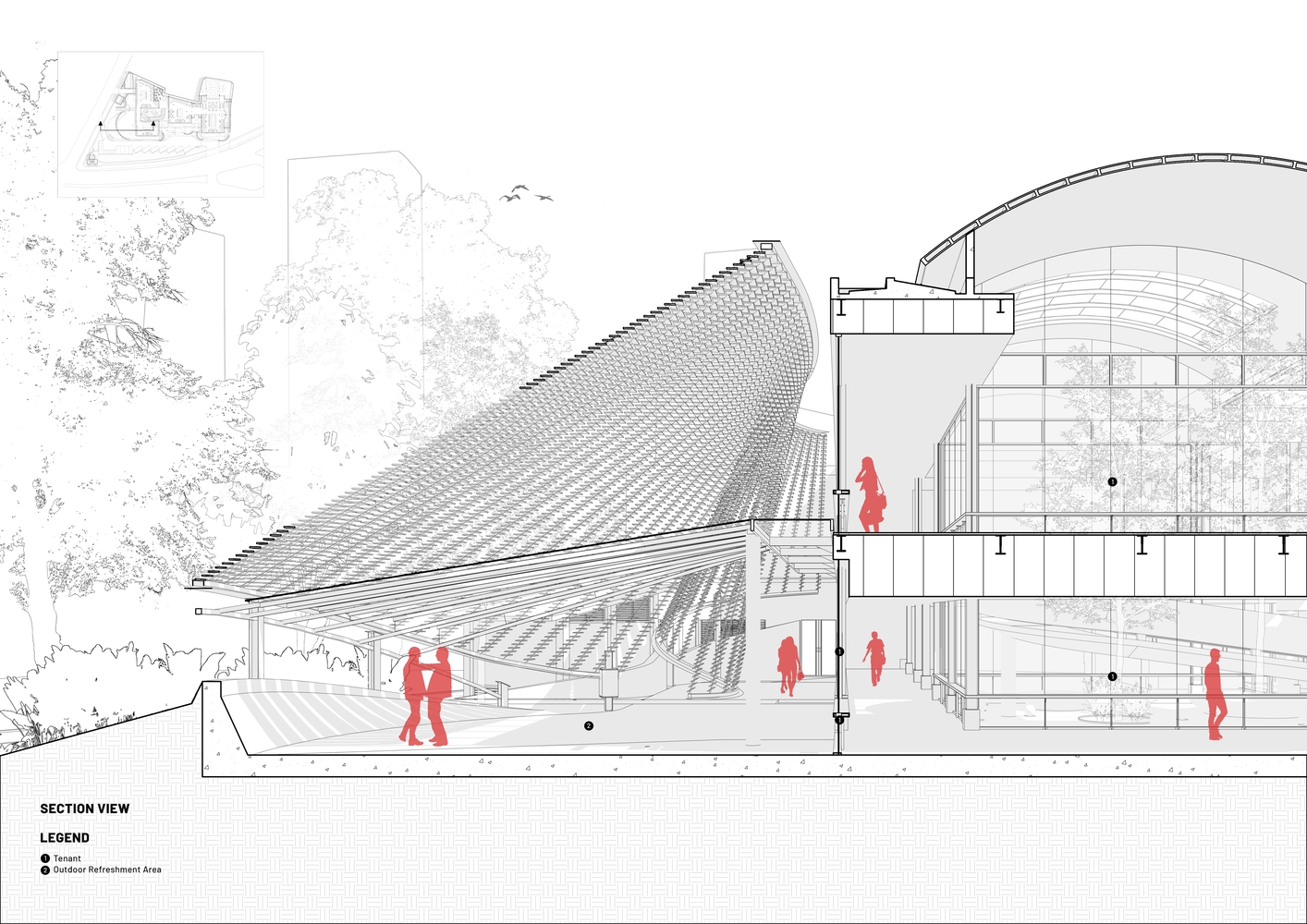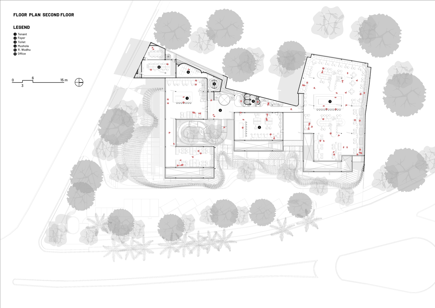 In a move to coexist with the site's ecology, the design maintains a minimal 40% ground cover, choreographing saleable areas and activity spaces to interweave with the existing 20-meter tall trees.