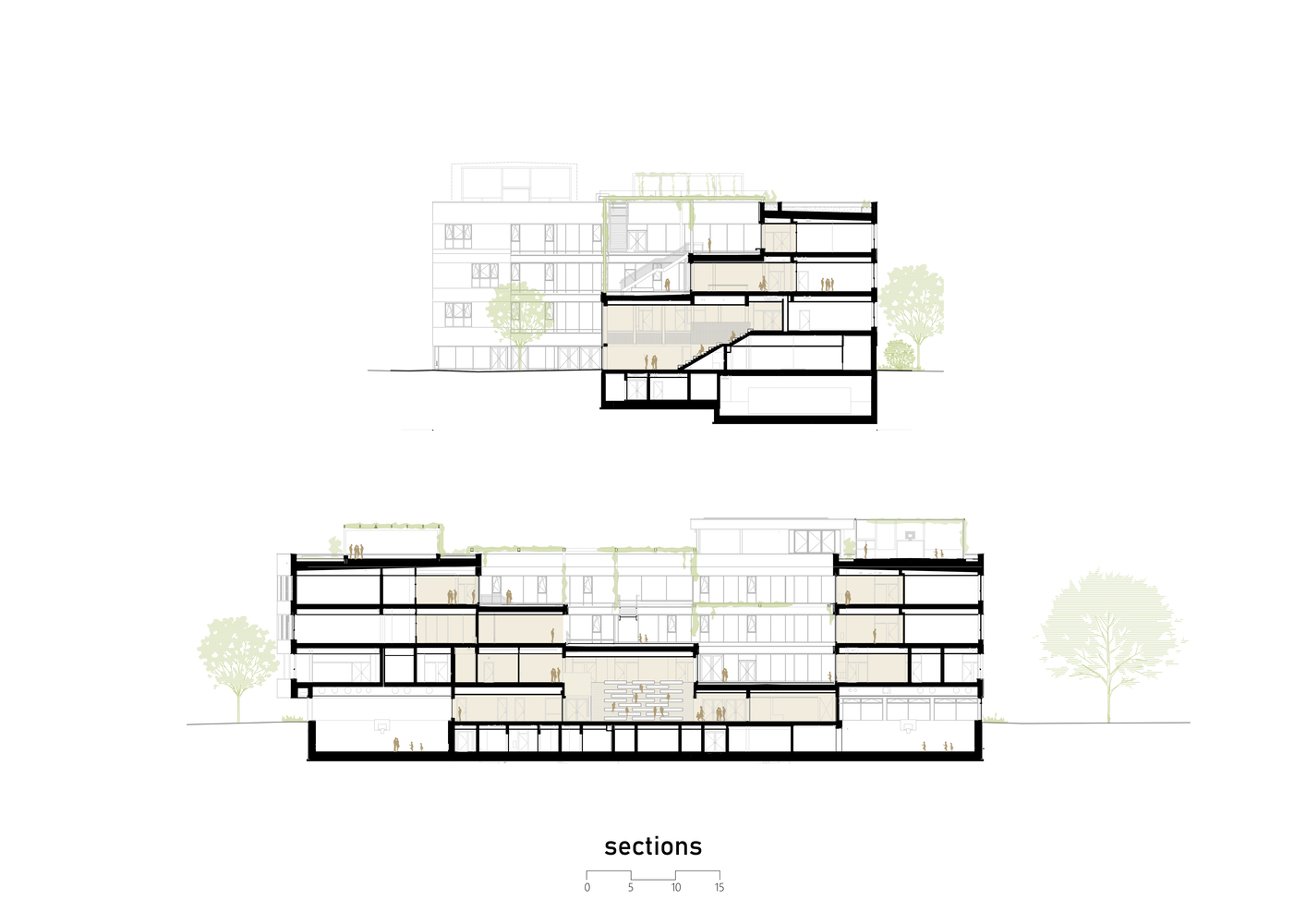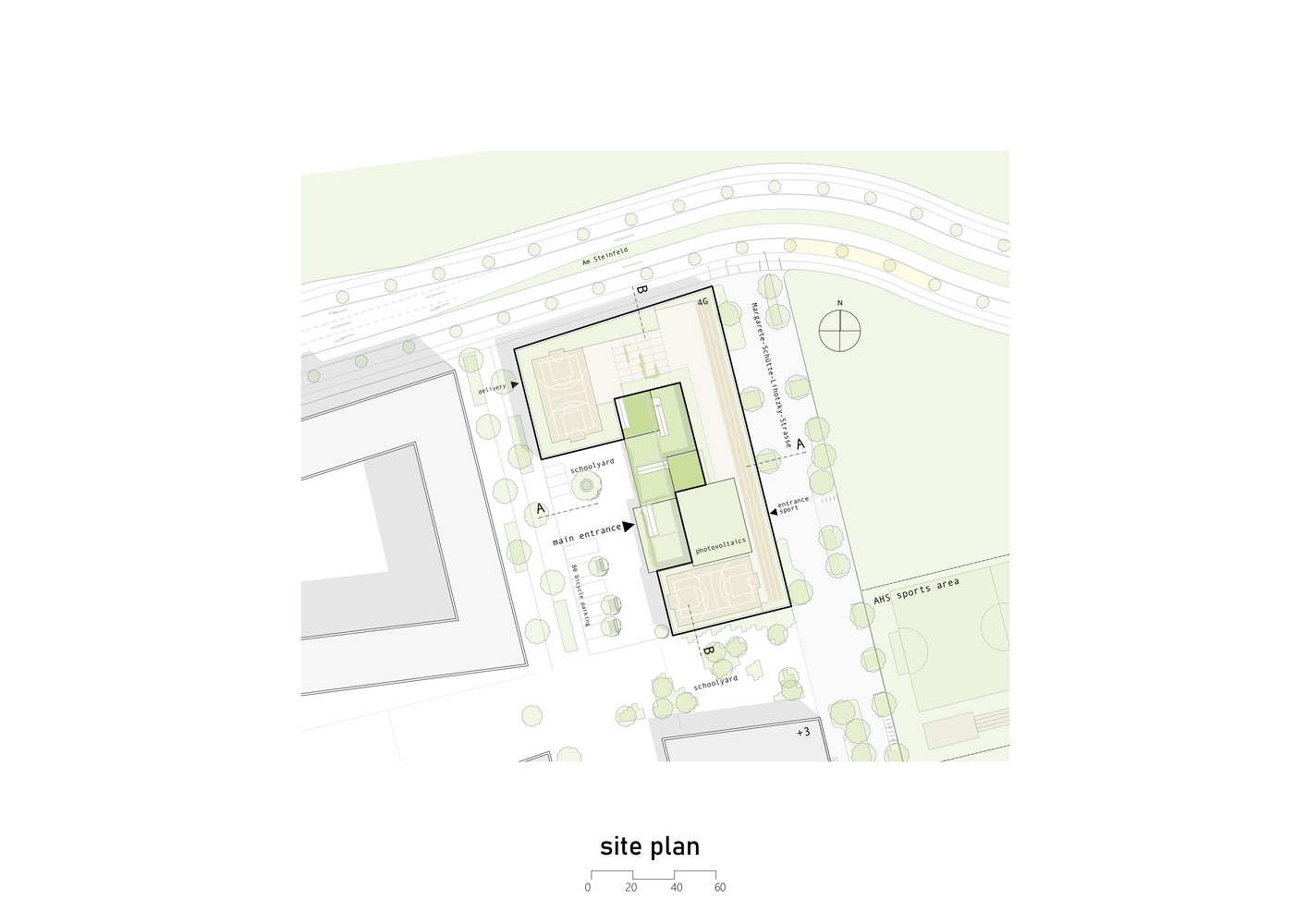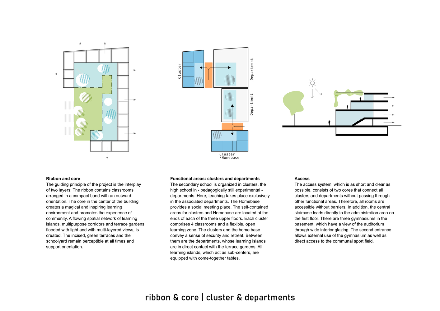 The guiding principle of the project is the interplay of two layers: The ribbon contains classrooms arranged in a compact band with an outward orientation.