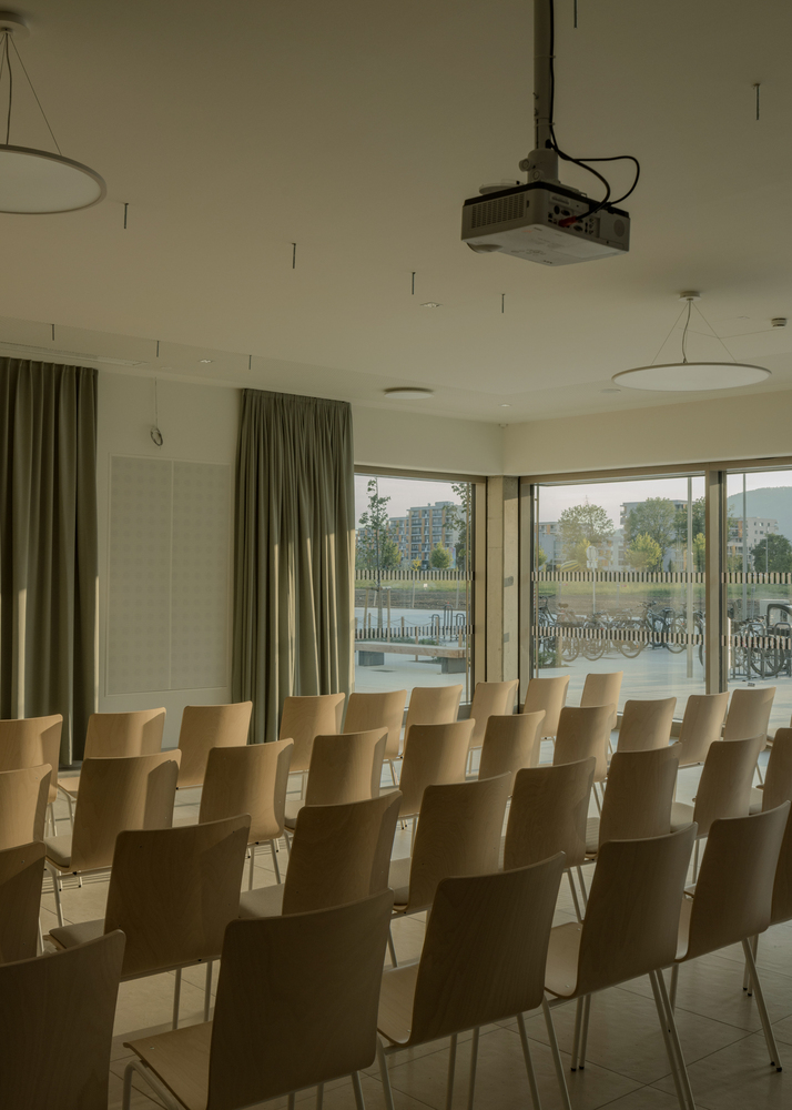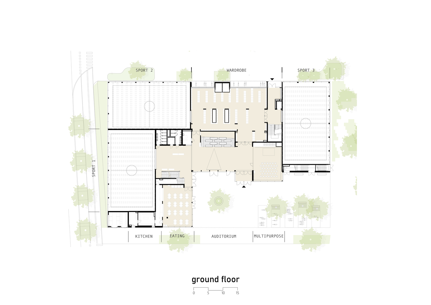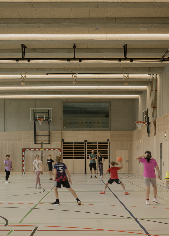 There are three gymnasiums in the basement, which have a view of the auditórium through wide interior glazing. The second entrance allows external use of the gymnasium as well as direct access to the communal sports field.