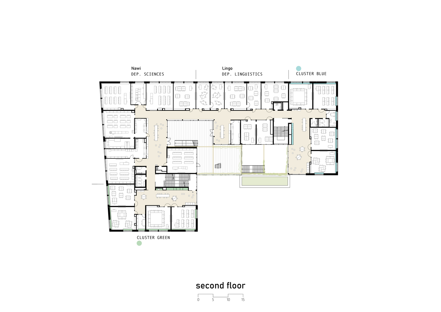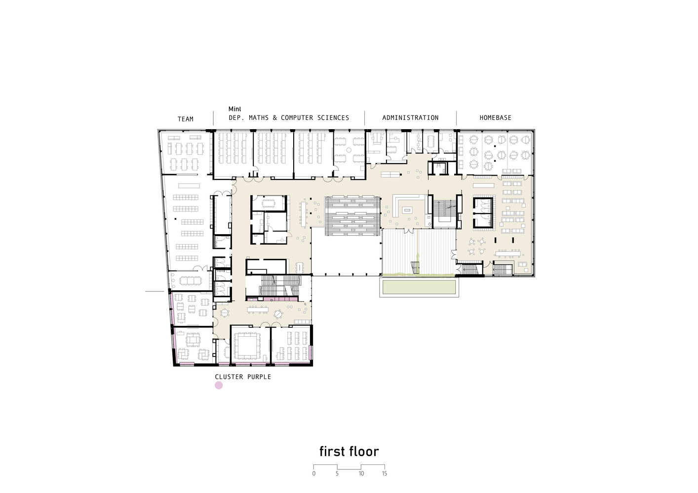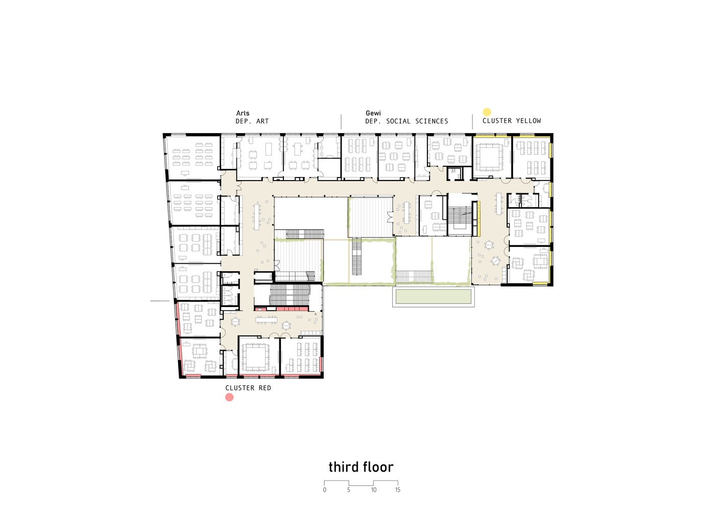 Here, teaching takes place exclusively in the associated departments. The Homebase provides a social meeting place. The self-contained areas for clusters and Homebase are located at the ends of each of the three upper floors.