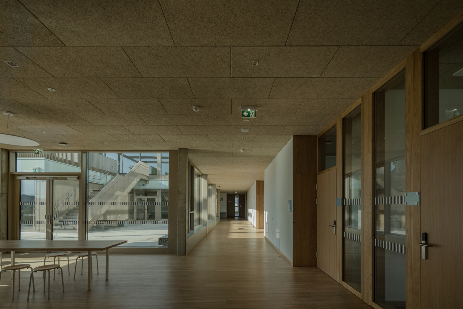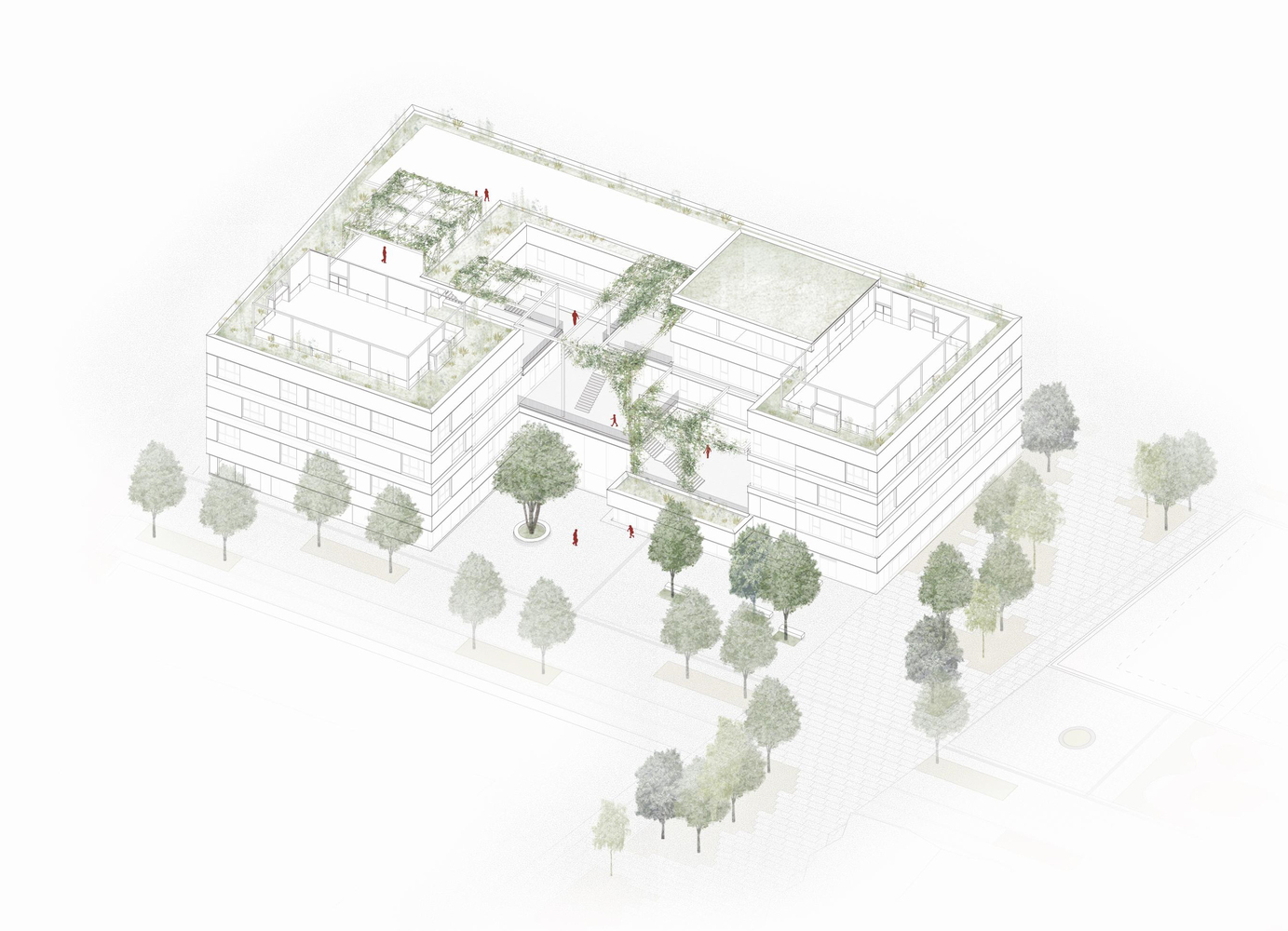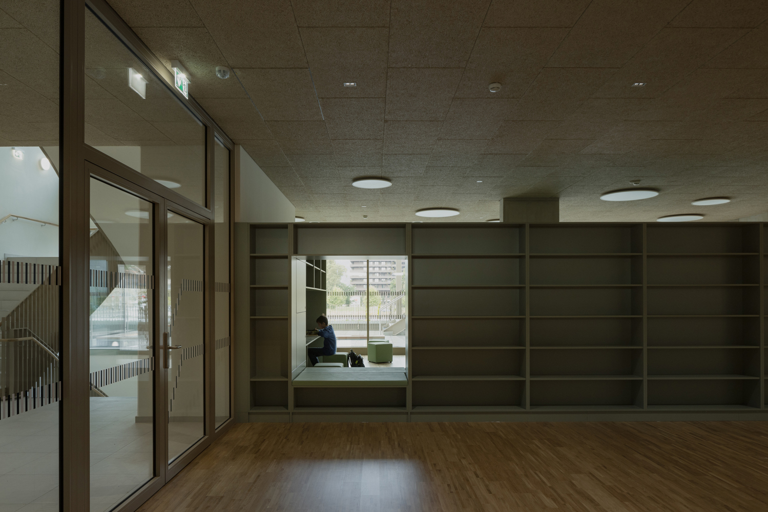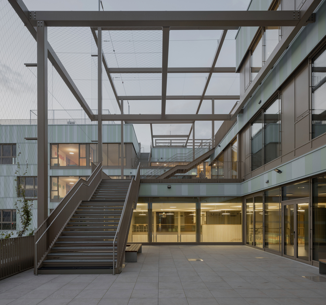 A flowing spatial network of learning islands, multipurpose corridors, and terrace gardens, flooded with light and with multi-layered views, is created. The incised, green terraces and the schoolyard remain perceptible at all times and support orientation.