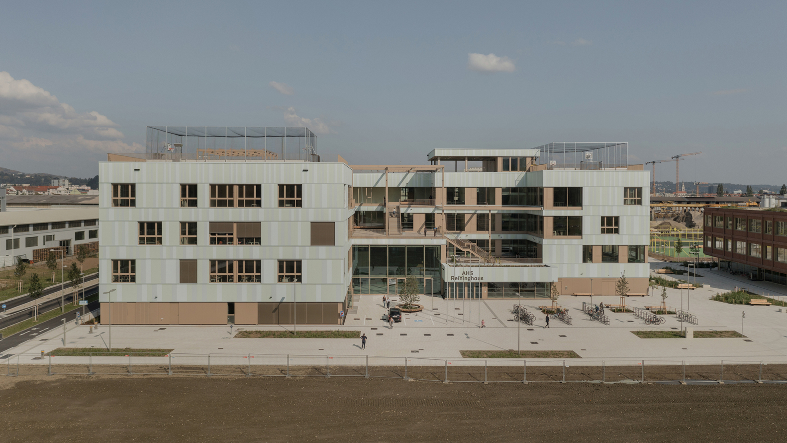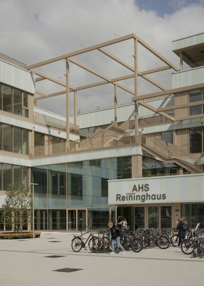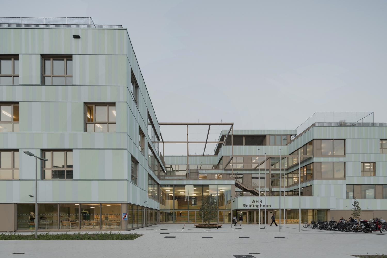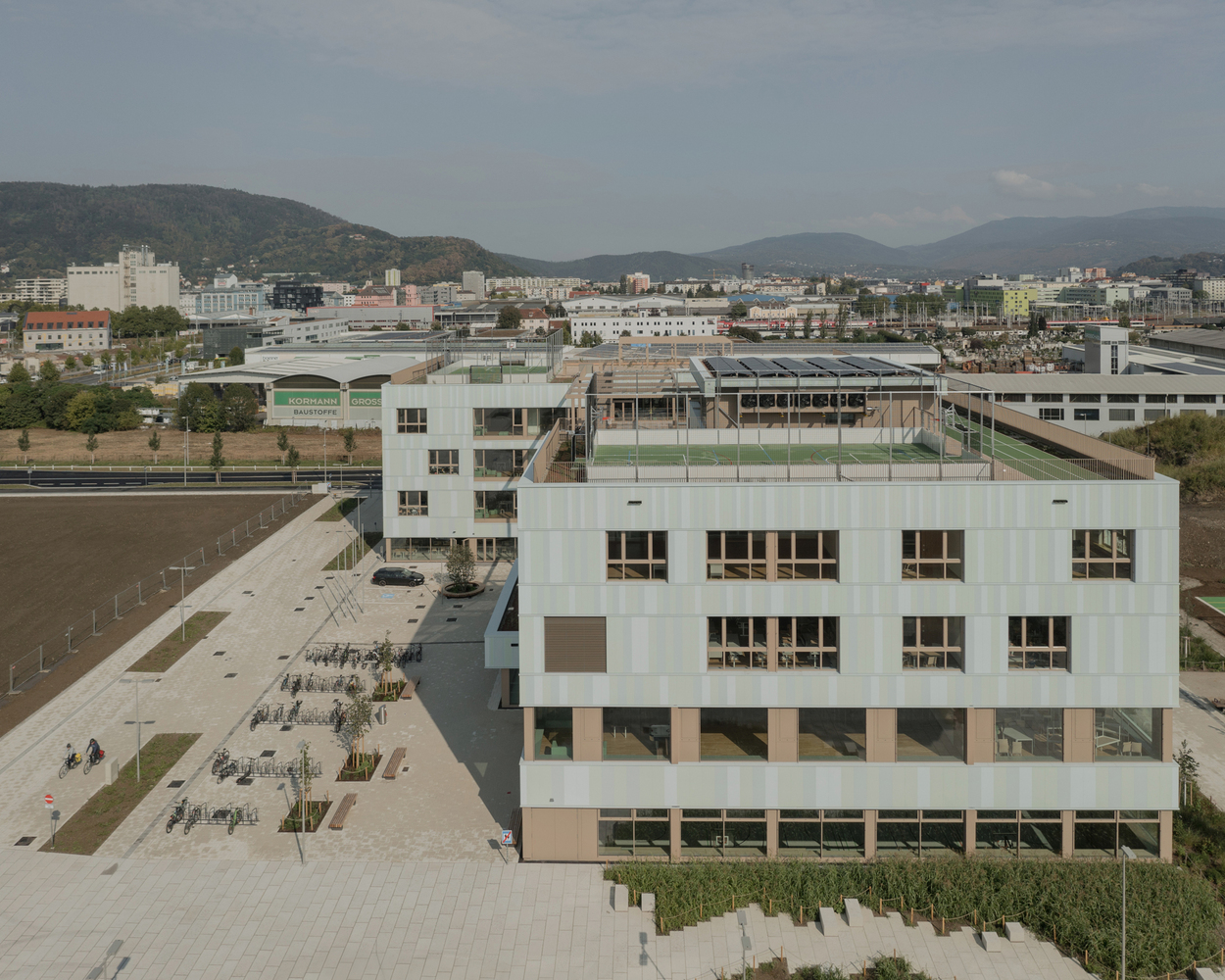 The 4-storey development of the AHS Reininghaus extends in an L-shape along the streets Am Steinfeld and Margarethe-SchütteLihotzky-Straße and forms the noise-protecting, north-eastern end of Quartier 12.