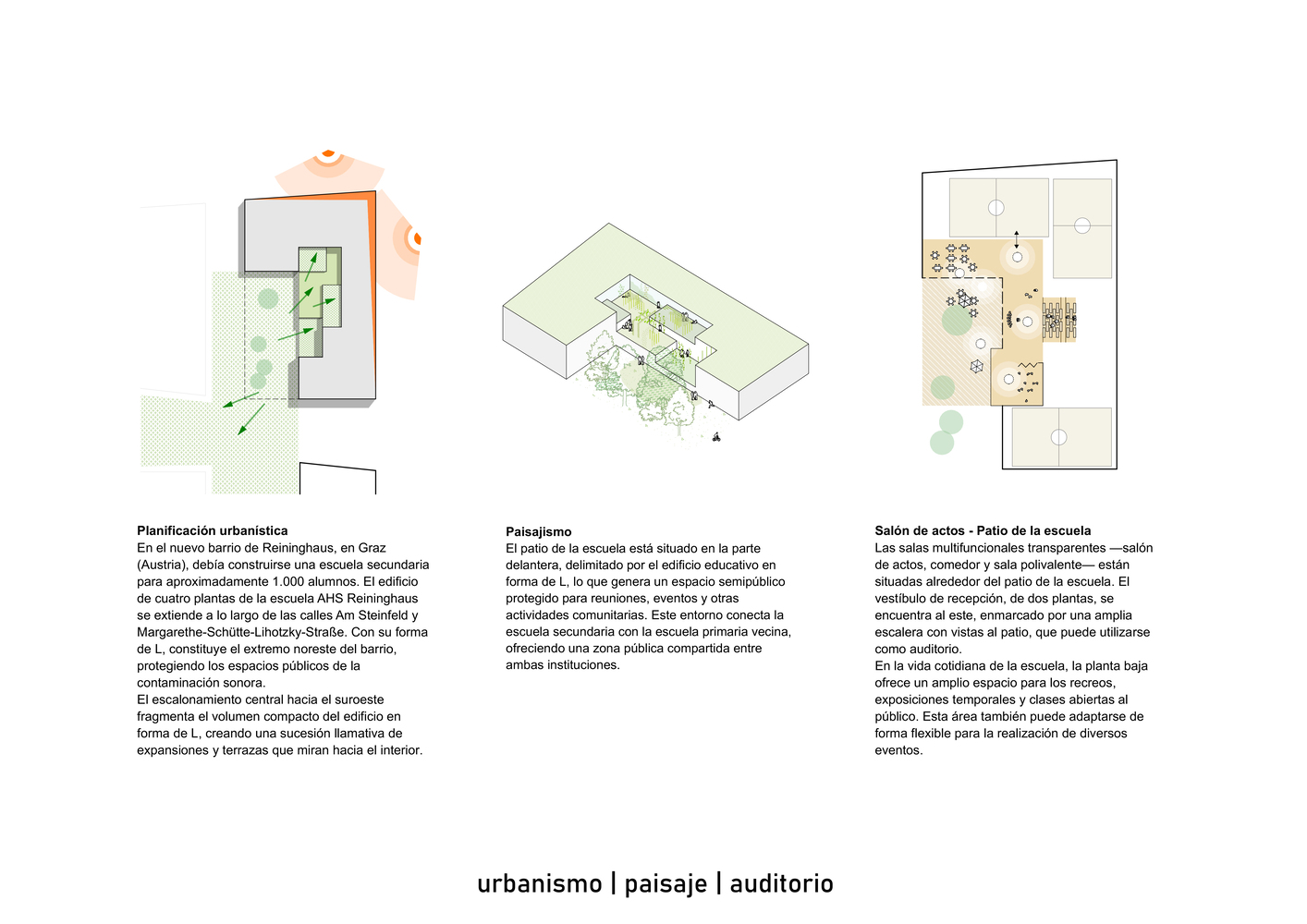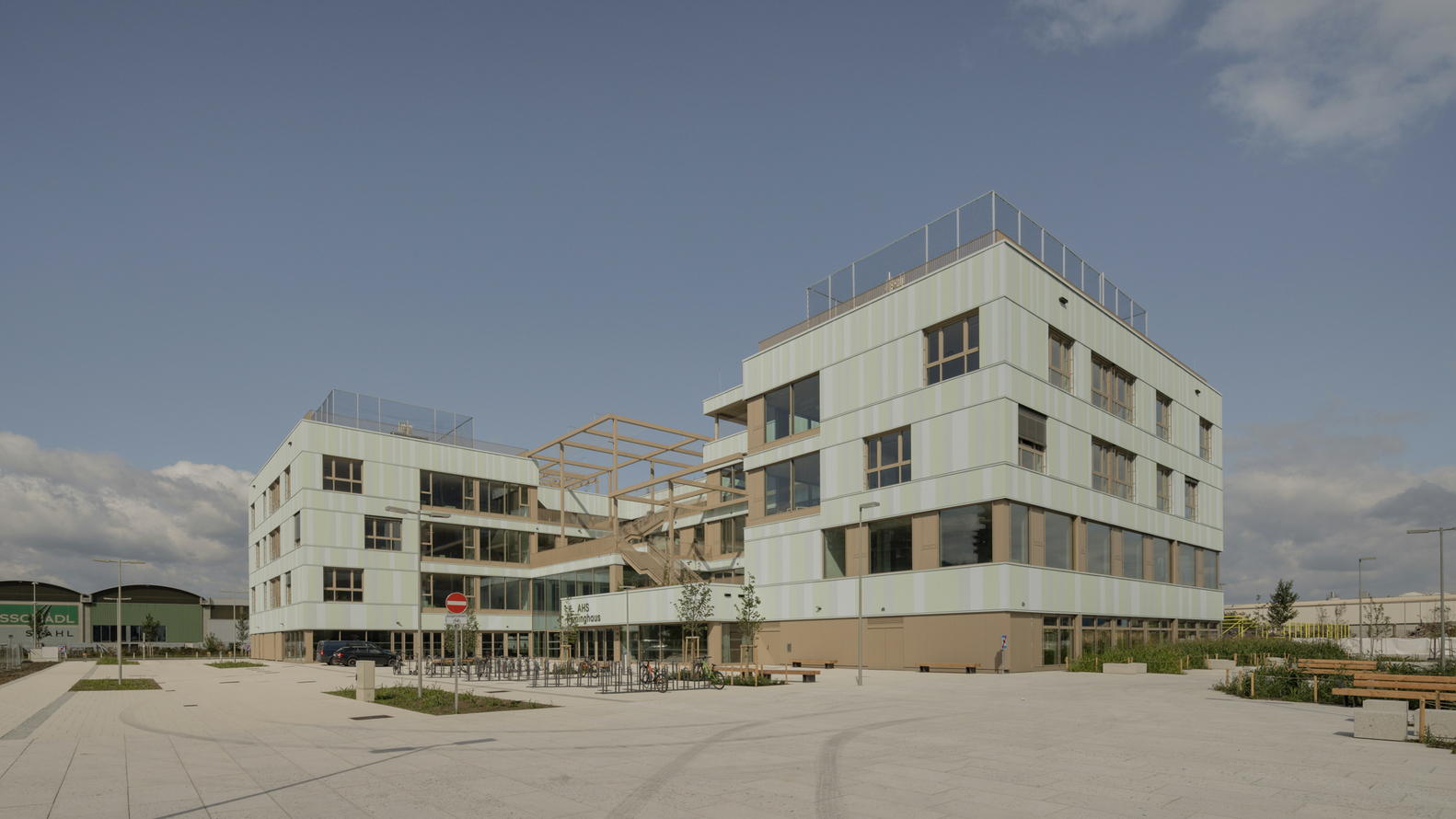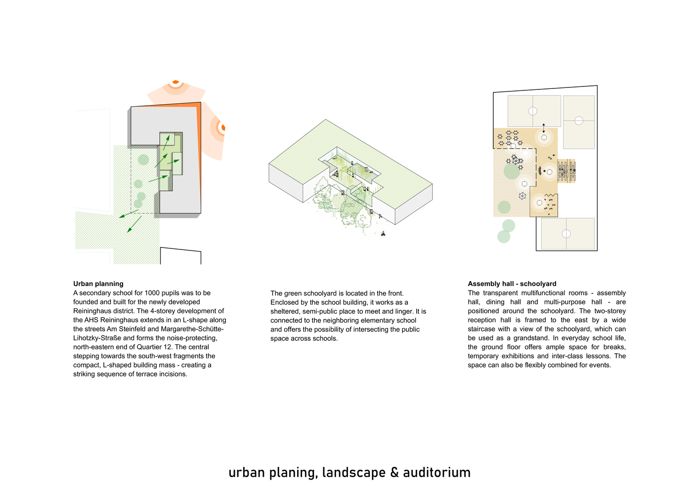 The 4-storey development of the AHS Reininghaus extends in an L-shape along the streets Am Steinfeld and Margarethe-SchütteLihotzky-Straße and forms the noise-protecting, north-eastern end of Quartier 12.