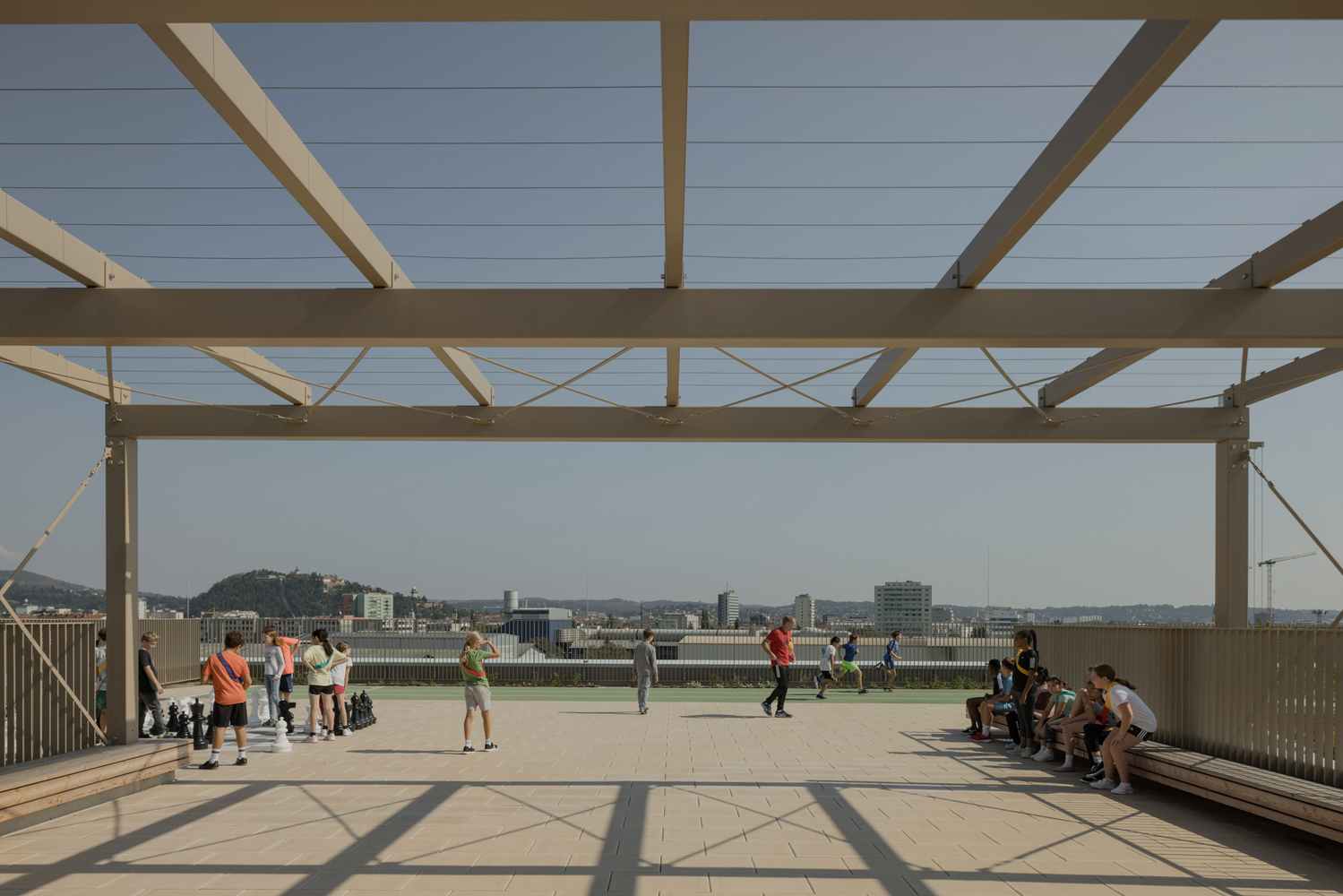 It is connected to the neighboring elementary school and offers the possibility of intersecting the public space across schools.