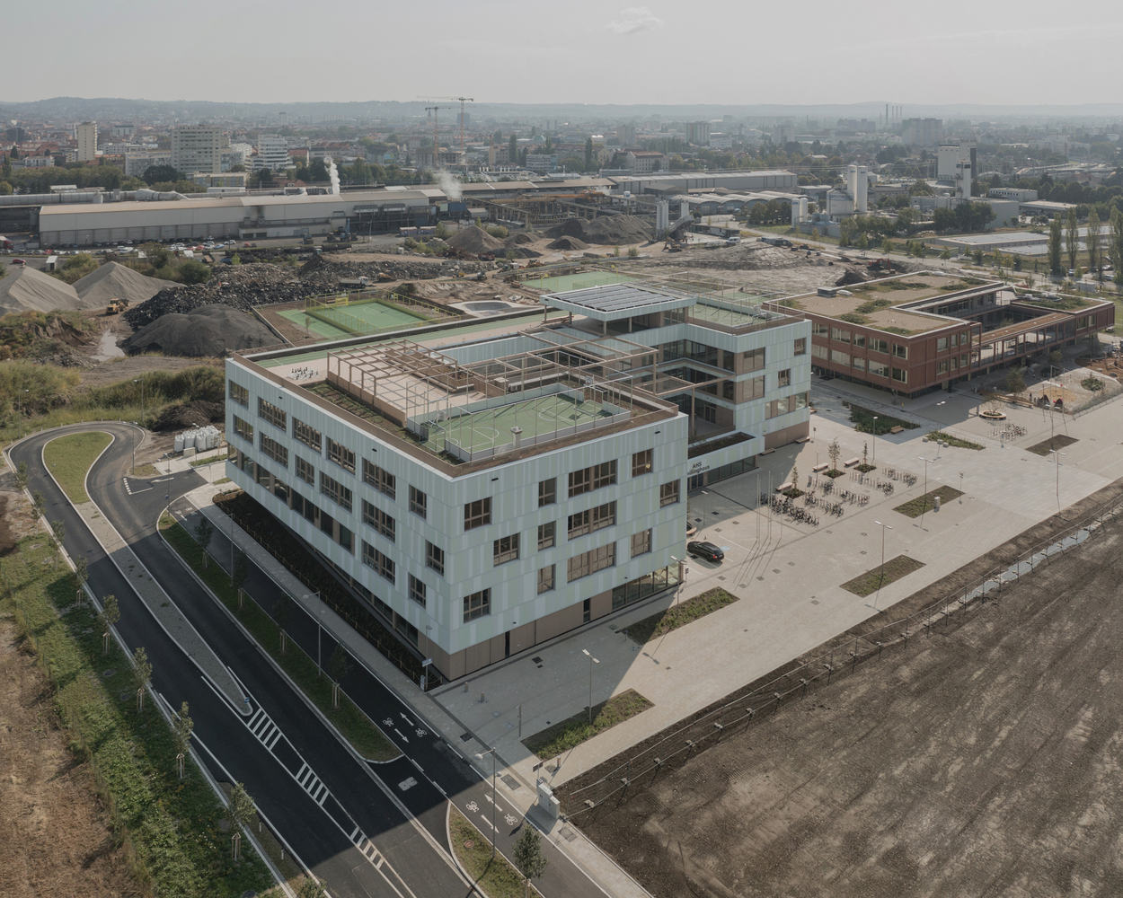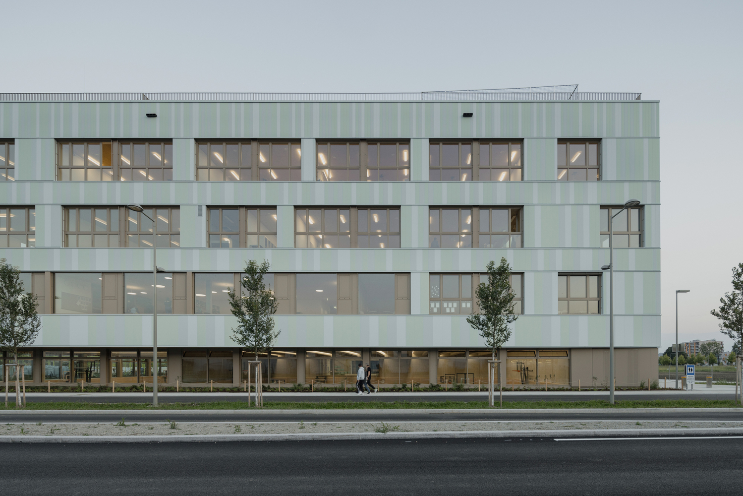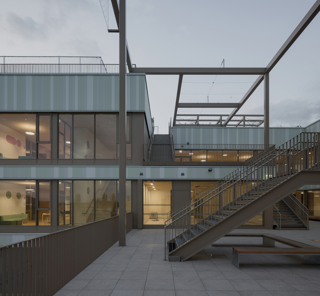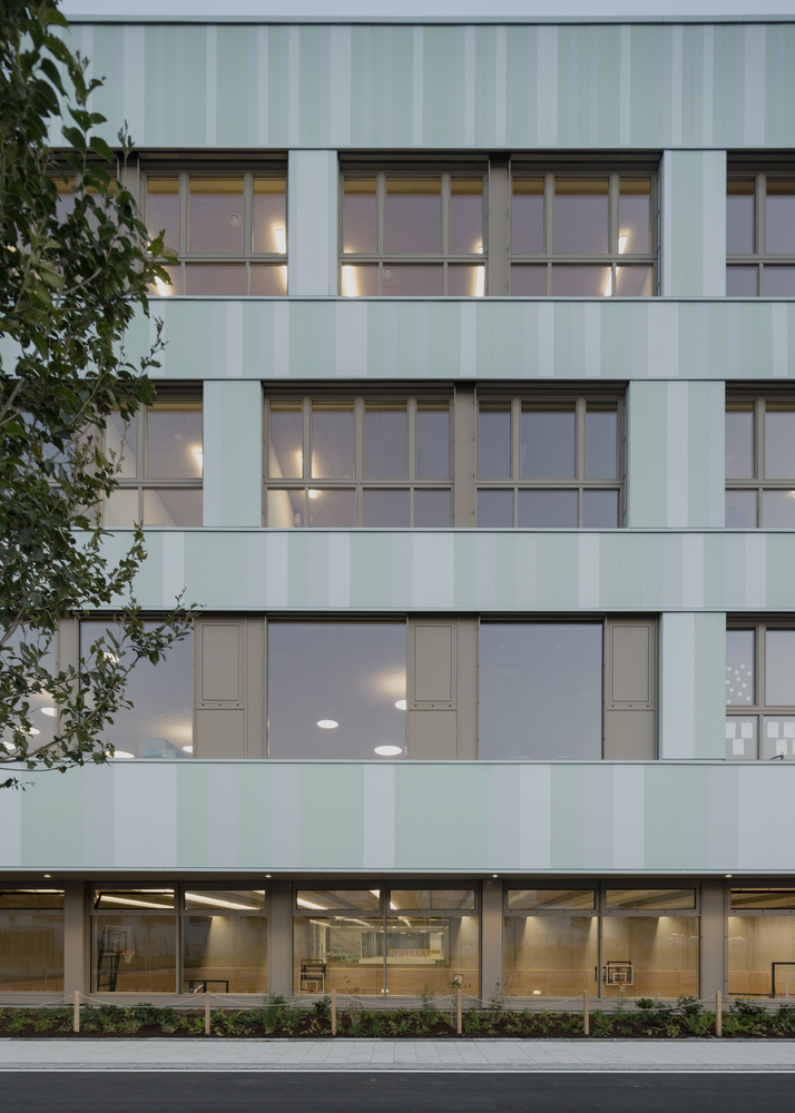 The roof impresses with fun courts, a running track, and a boulder wall. The façade design extends the idea of greening the building and gives the school a friendly face in a still fallow environment. The gradations in the color scheme break up the building towards the top.