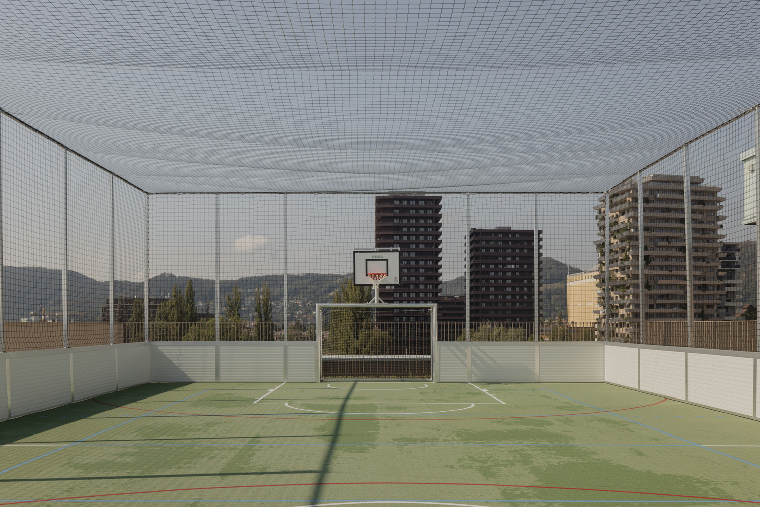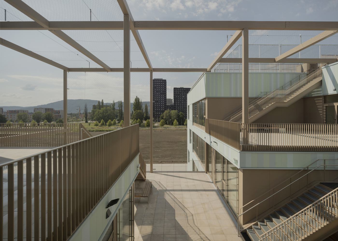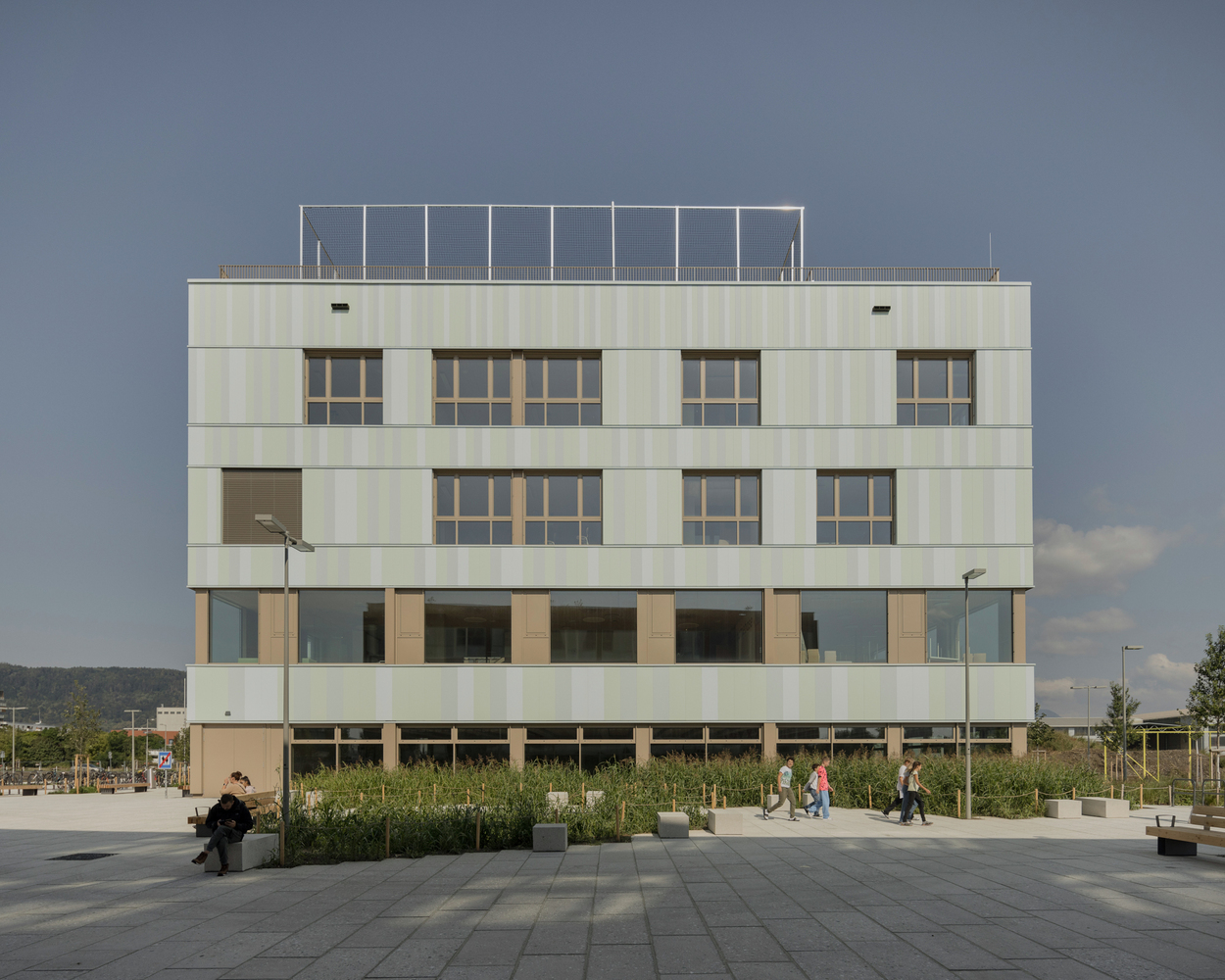 The roof impresses with fun courts, a running track, and a boulder wall. The façade design extends the idea of greening the building and gives the school a friendly face in a still fallow environment. The gradations in the color scheme break up the building towards the top.