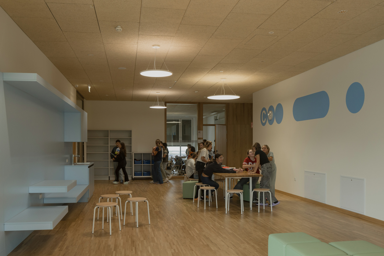 In everyday school life, the ground floor offers ample space for breaks, temporary exhibitions, and inter-class lessons. The space can also be flexibly combined for events.