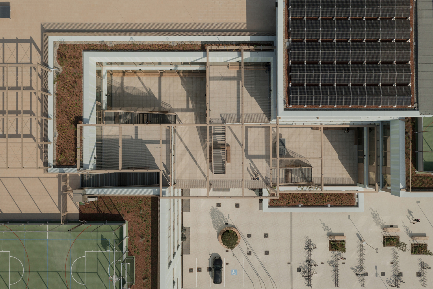 An external staircase connects the entire terrace and roof landscape. Here you will find various green and shaded recreational areas that can be used as outdoor classrooms.