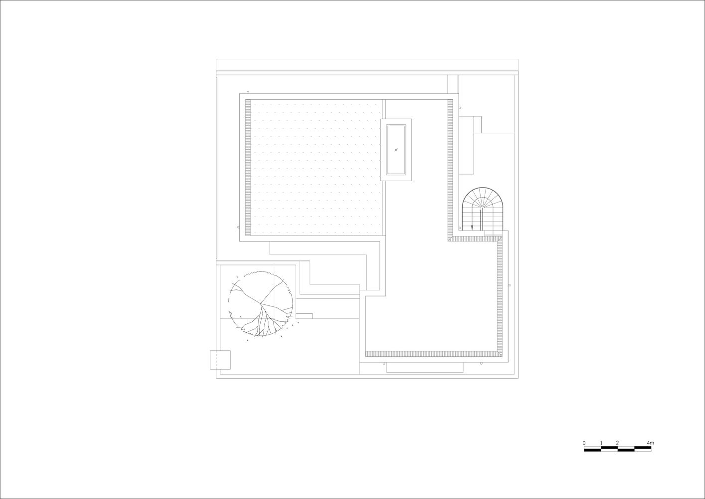 The stone paving is divided into permeable zones and rapid impermeable drainage zones based on the rainwater flow path. Additionally, half of the roof is covered with soil to serve as an experimental green roof area, exploring the subtle relationship between soil and rainwater.